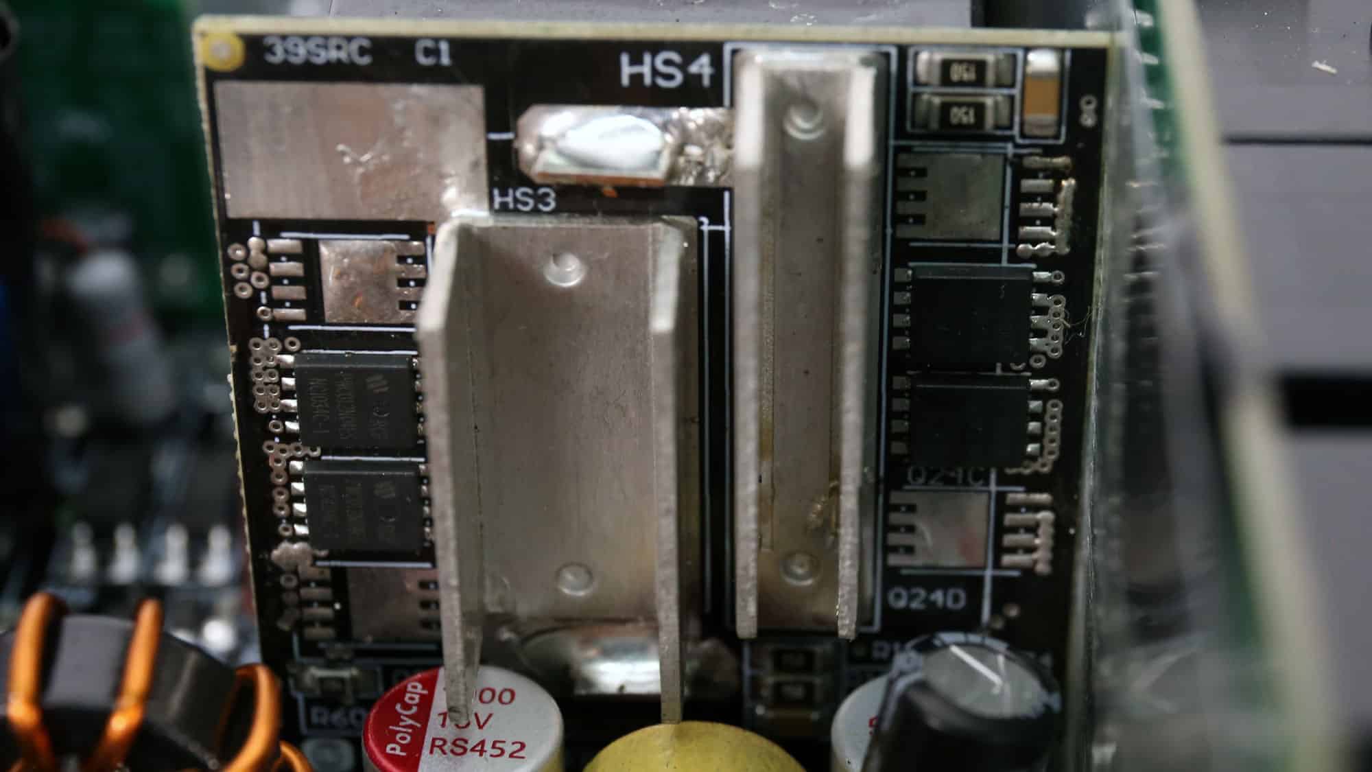 The APFC converter uses two PingWei PWE120N65SFMF FETs and one Global Power G4S06508AT boost diode. Chemi-Con manufactures the bulk capacitor, with a capacity of 470uF. It is rated for 2,000 hours at 105 °C. Its voltage rating is borderline at 400V, given that the APFC’s DC bus voltage is approximately 380V DC.