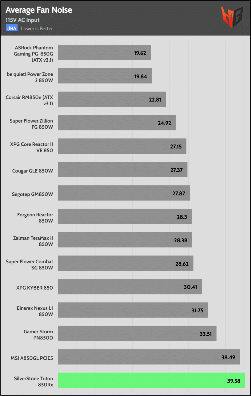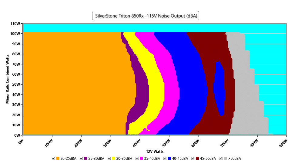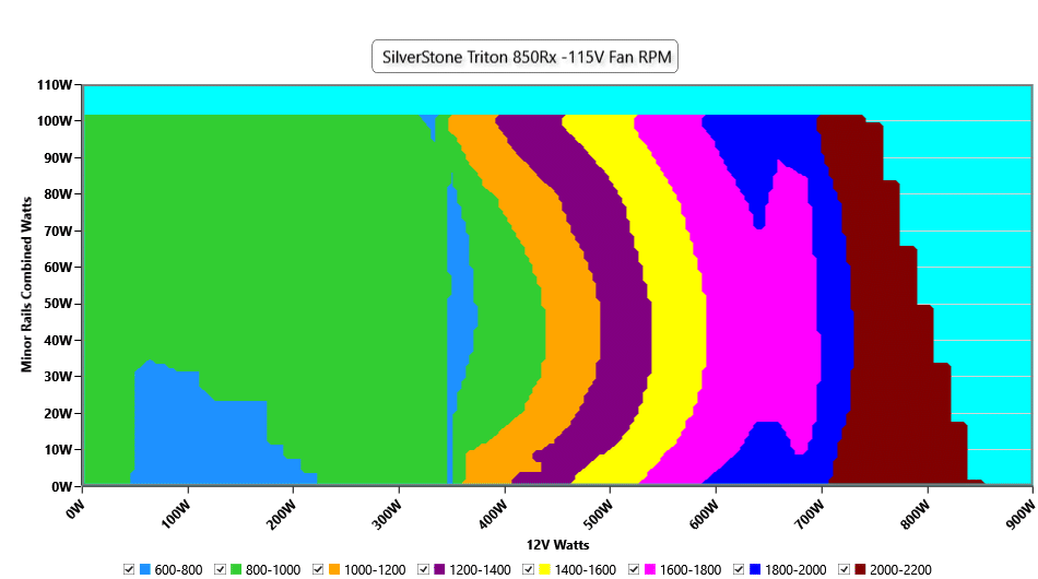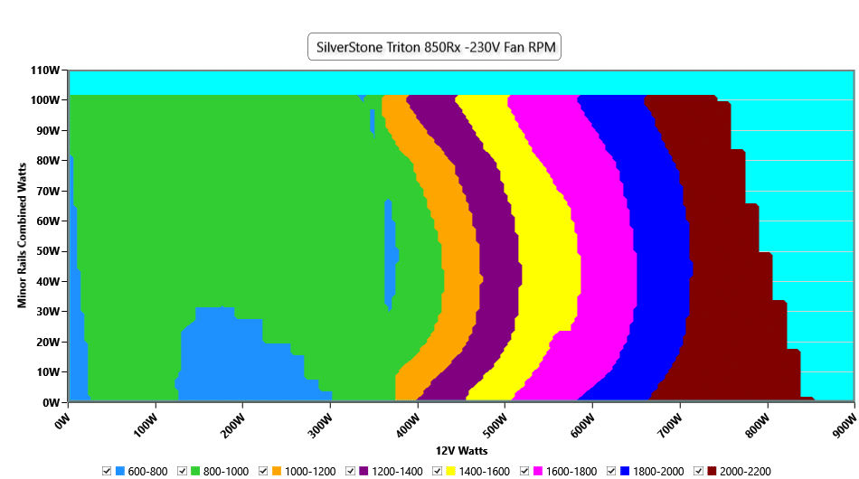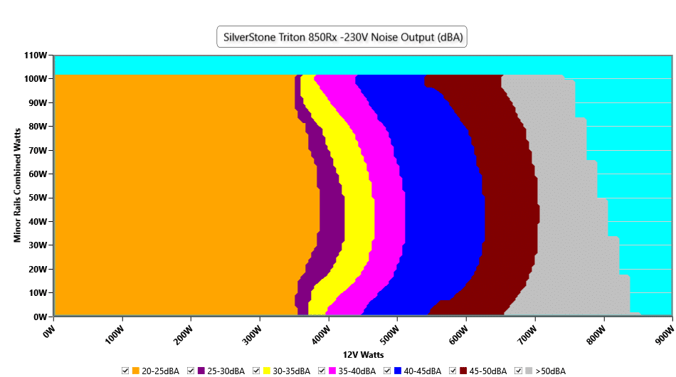 The 230V fan speed profile becomes more aggressive than the 115V one at high loads, with over 50 dBA operation starting at around 660W, rather than 700W at 115V. This is why the average noise at 230V is higher than at 115V. At up to 550W, the 115V and 230V fan speed profiles are almost similar.