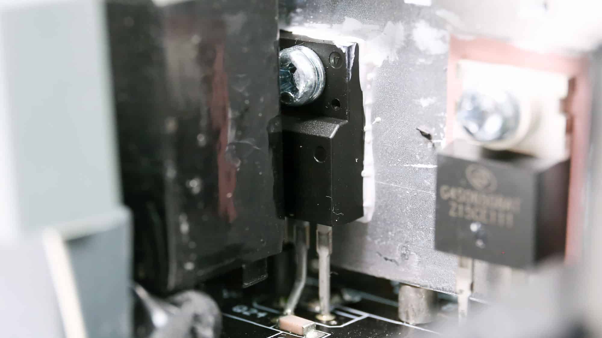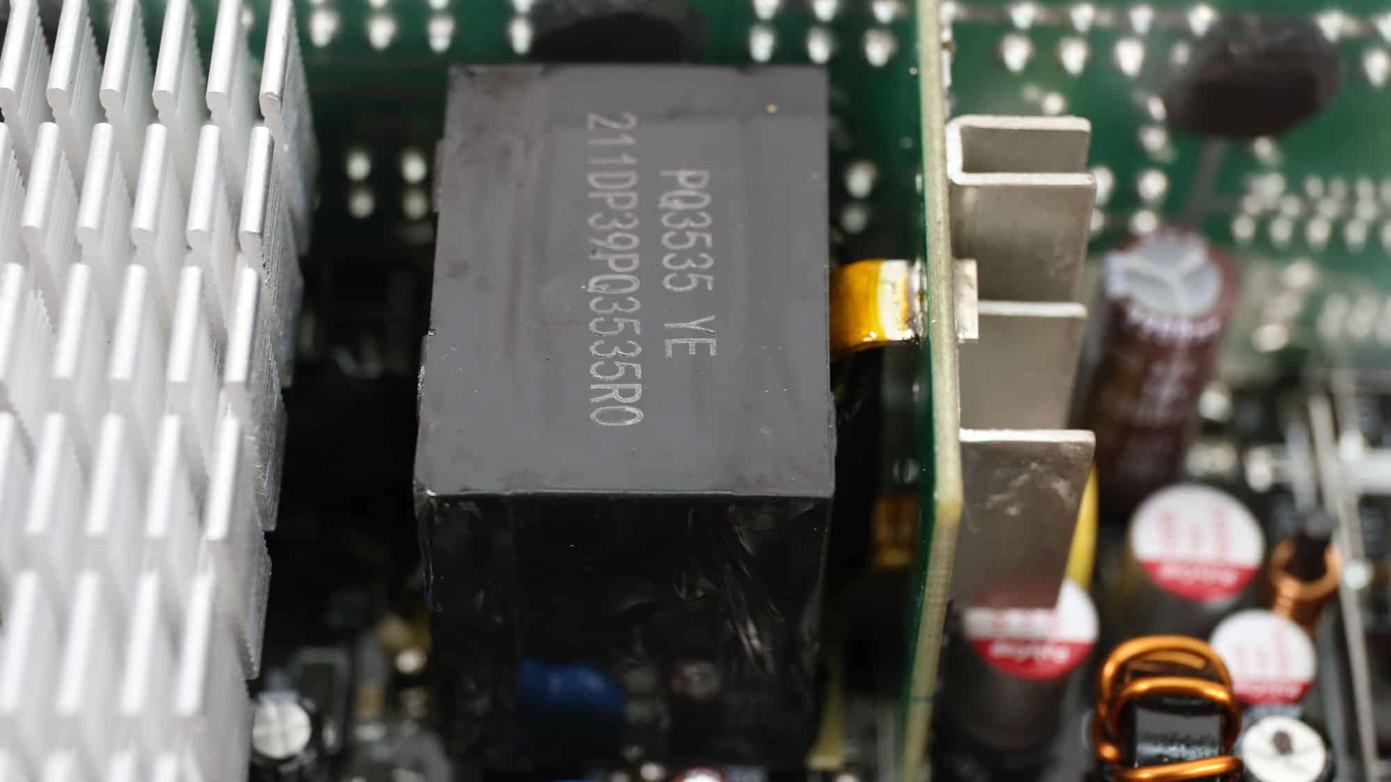 The APFC converter uses two PingWei PWE120N65SFMF FETs and one Global Power G4S06508AT boost diode. Chemi-Con manufactures the bulk capacitor with a capacity of 680 μF. It is rated for 2,000 hours at 105 °C. Its voltage rating is borderline at 400V, given that the APFC’s DC bus voltage is approximately 380V DC.