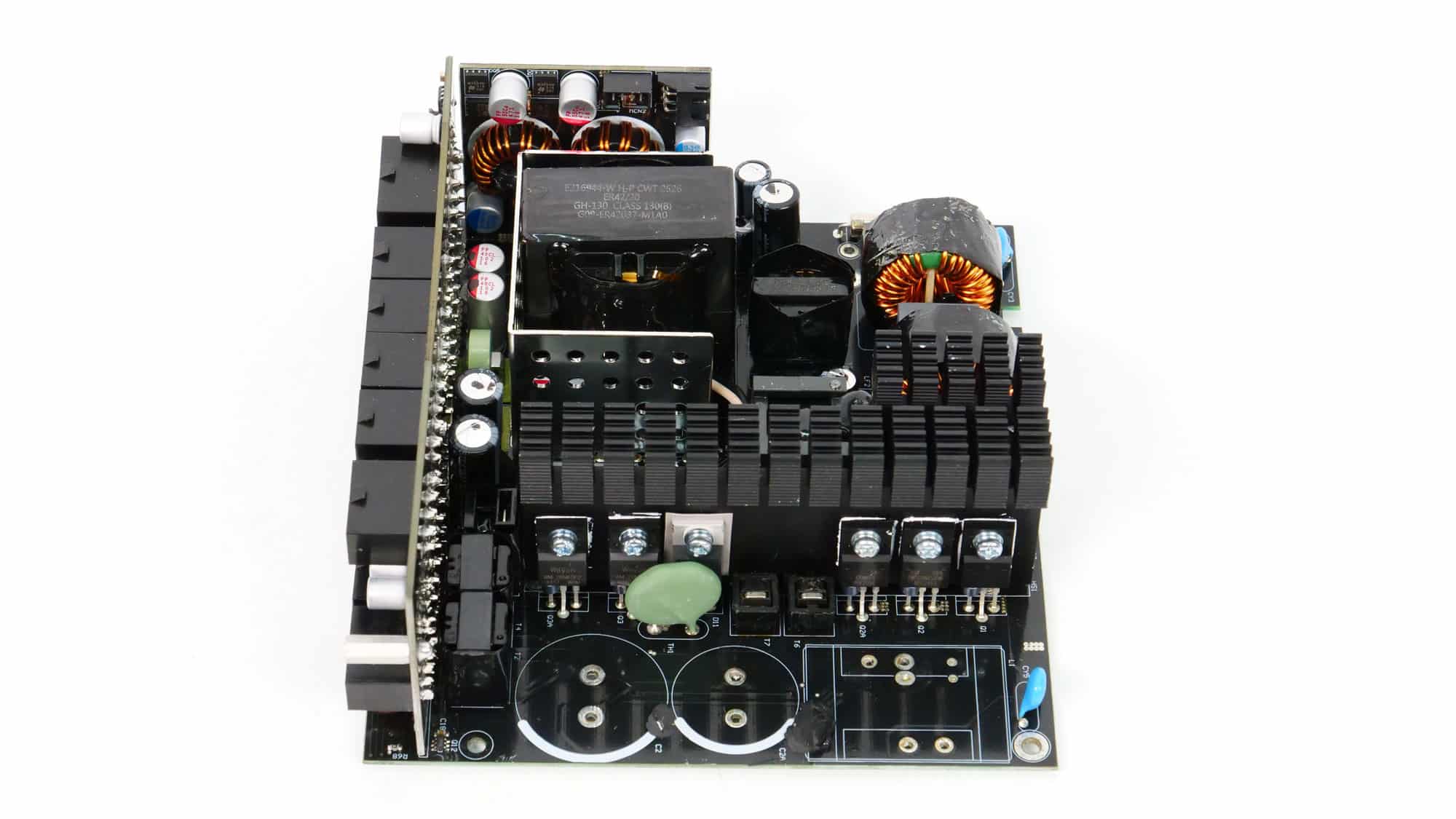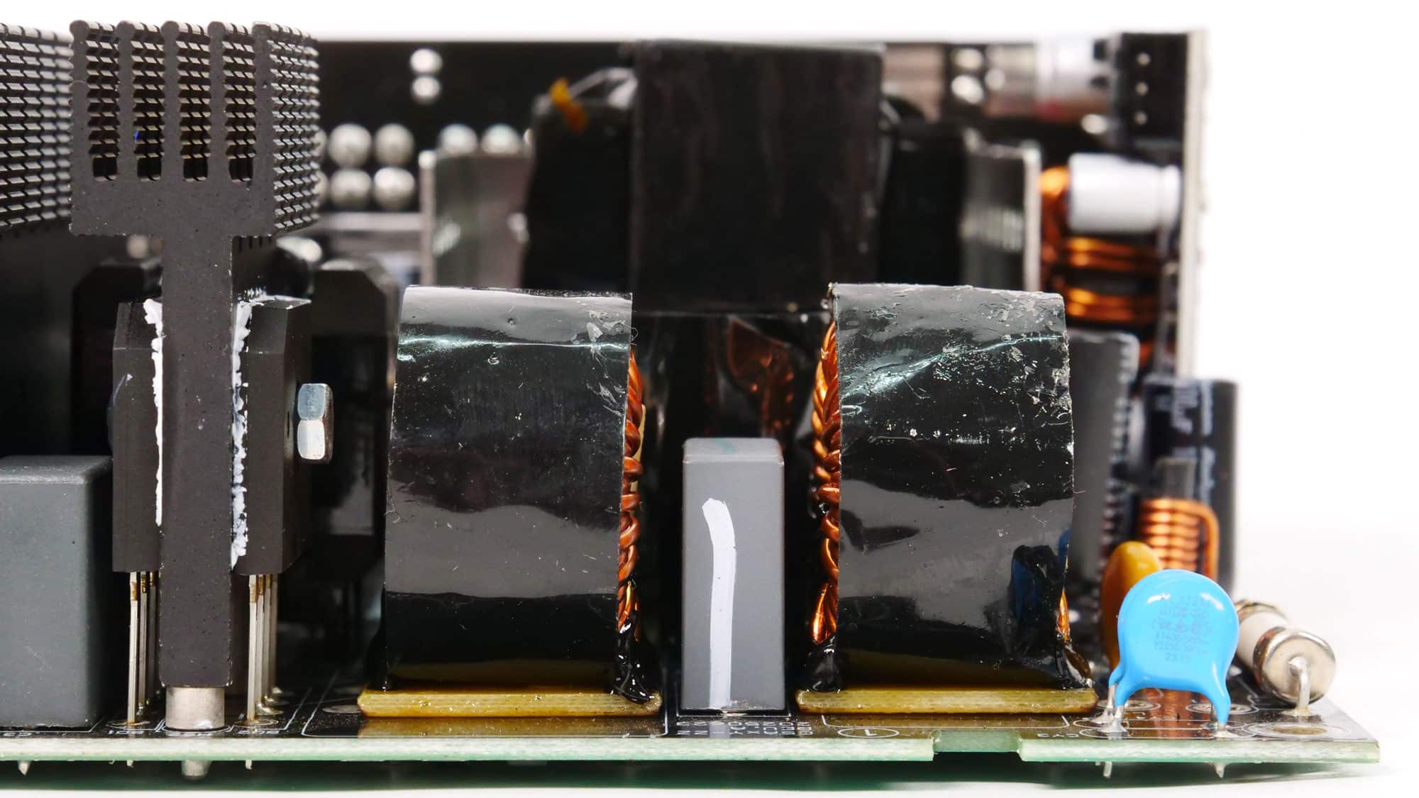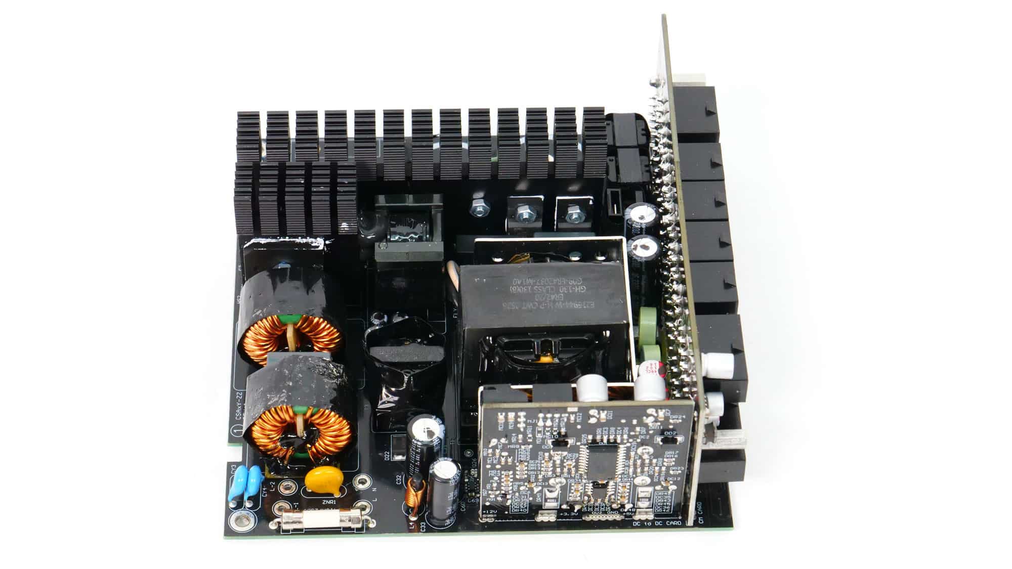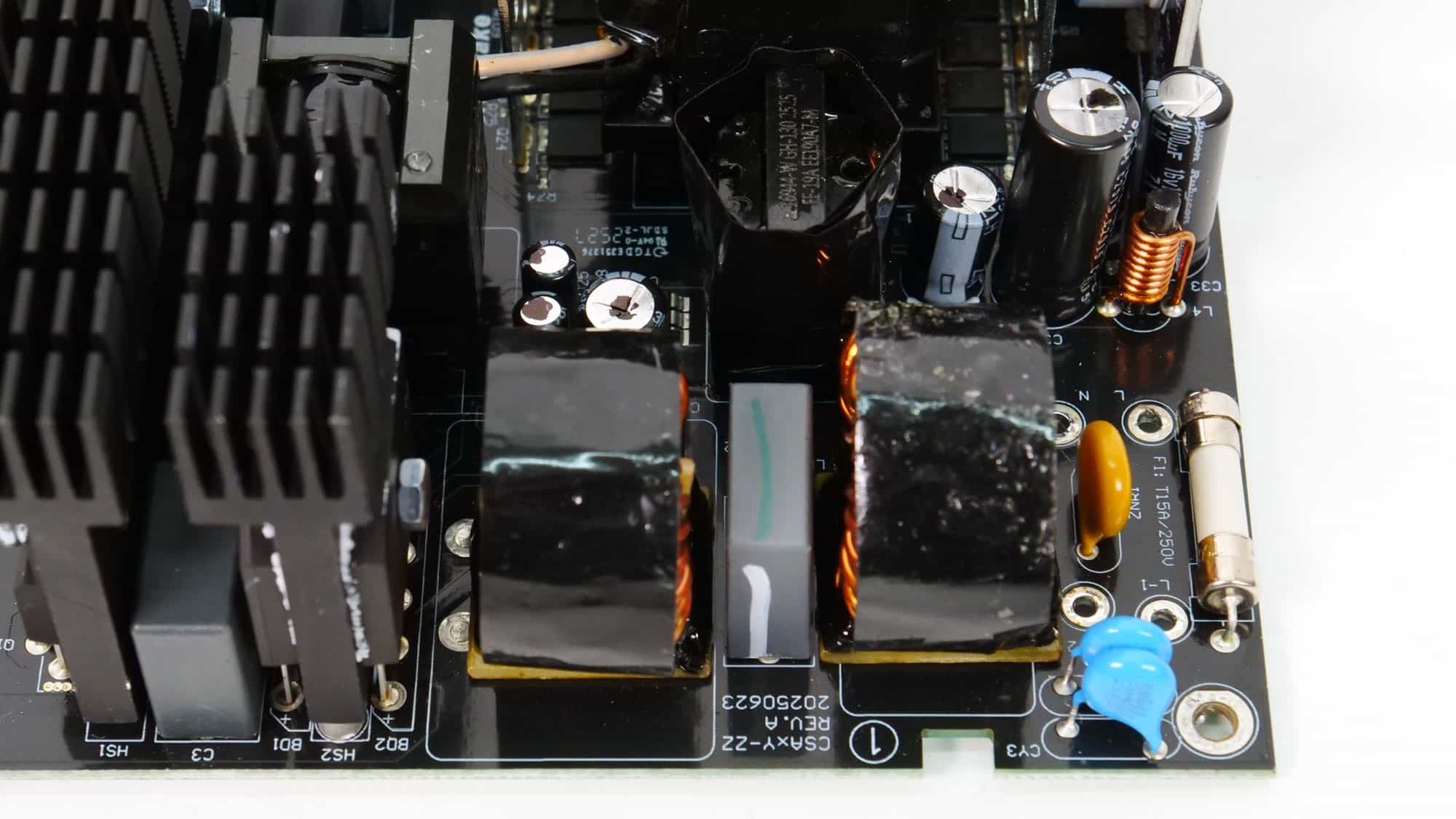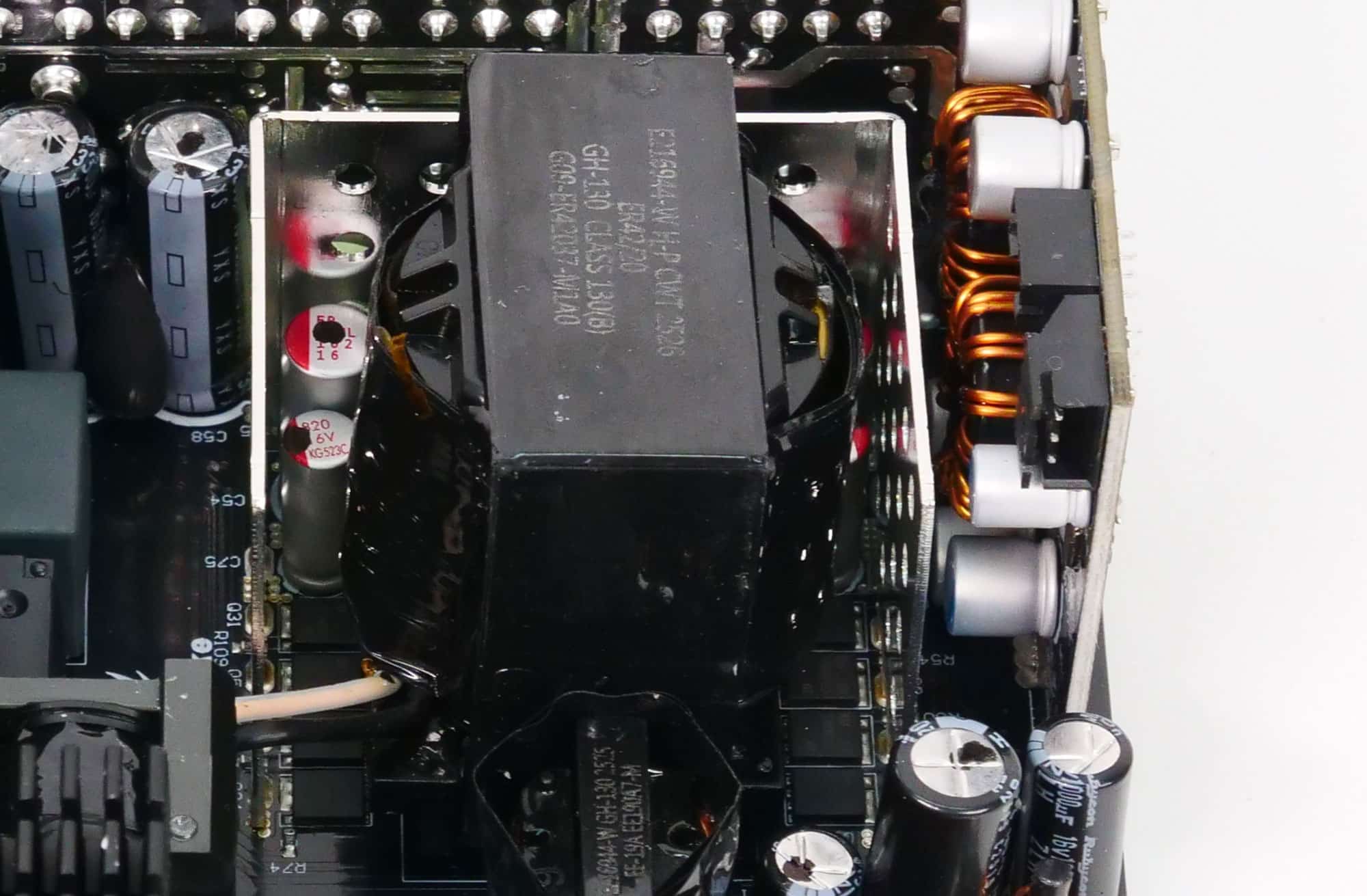 This is the same platform used in the PT 1200 model, with some component changes due to the lower maximum power output. CWT provides the platform, featuring a contemporary design with a full-bridge topology on the primary side and an LLC resonant converter for reduced energy losses. The PCB is compact, and to keep the parts cool without overspinning the fan, CWT used large heatsinks on the primary side. Typically, for a CWT design, the heatsinks on the secondary side are way smaller. Basically, the secondary’s side heatsink is a plate surrounding three sides of the main transformer, providing cooling and acting as a common-mode EMI shield. The same aluminum cover of the main transformer also offers limited high-frequency magnetic shielding.