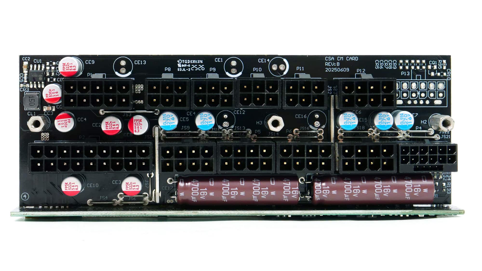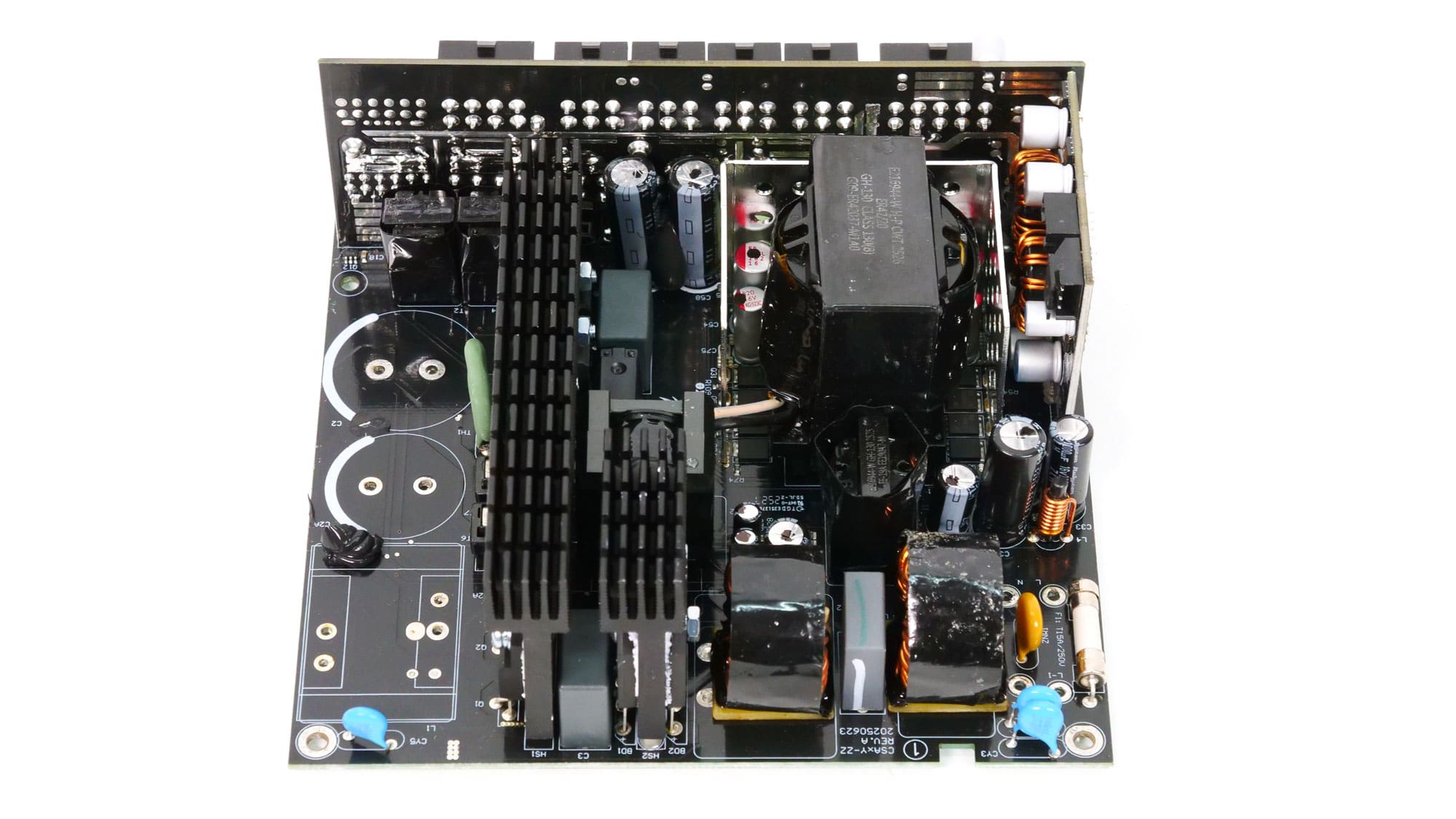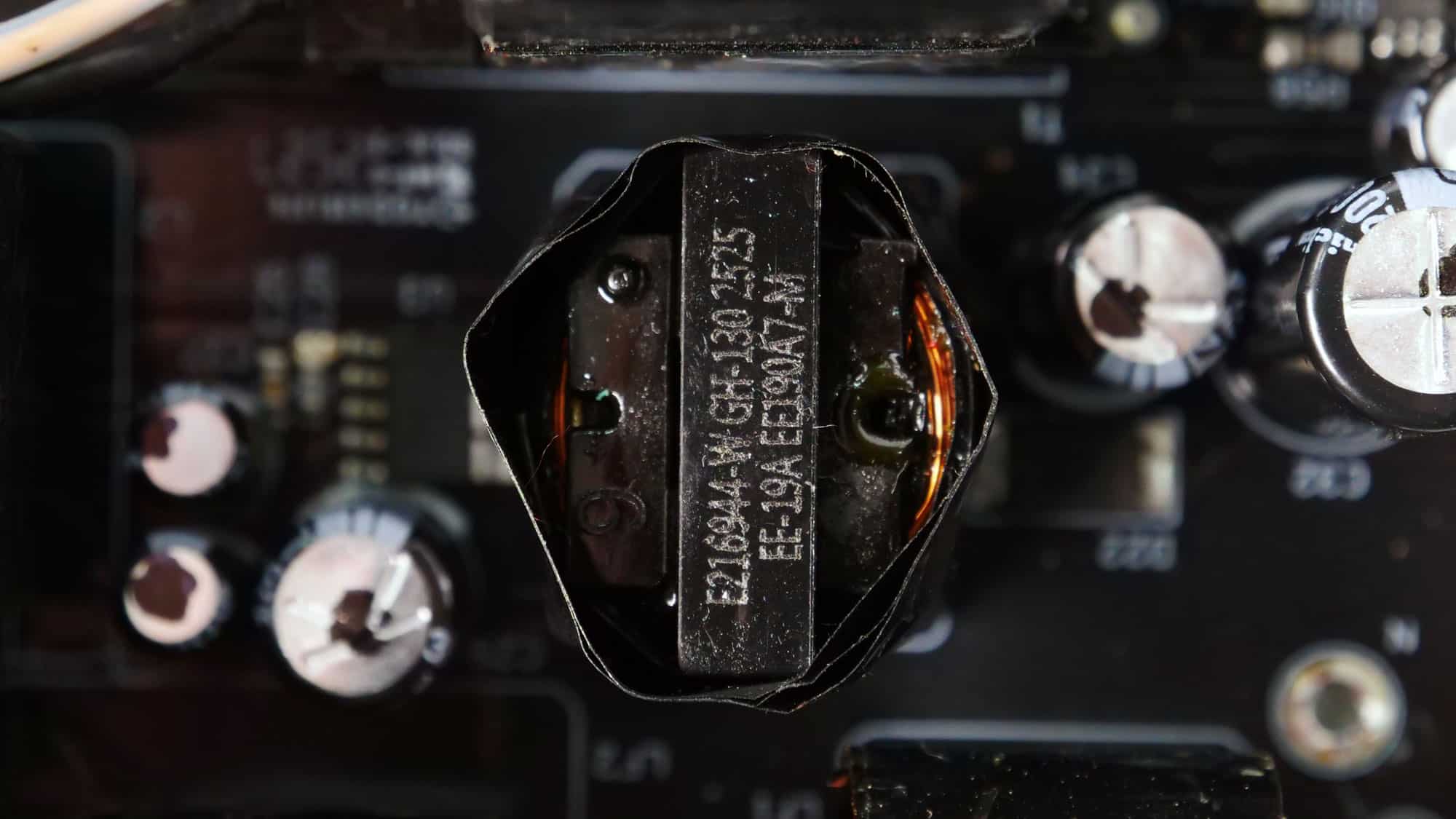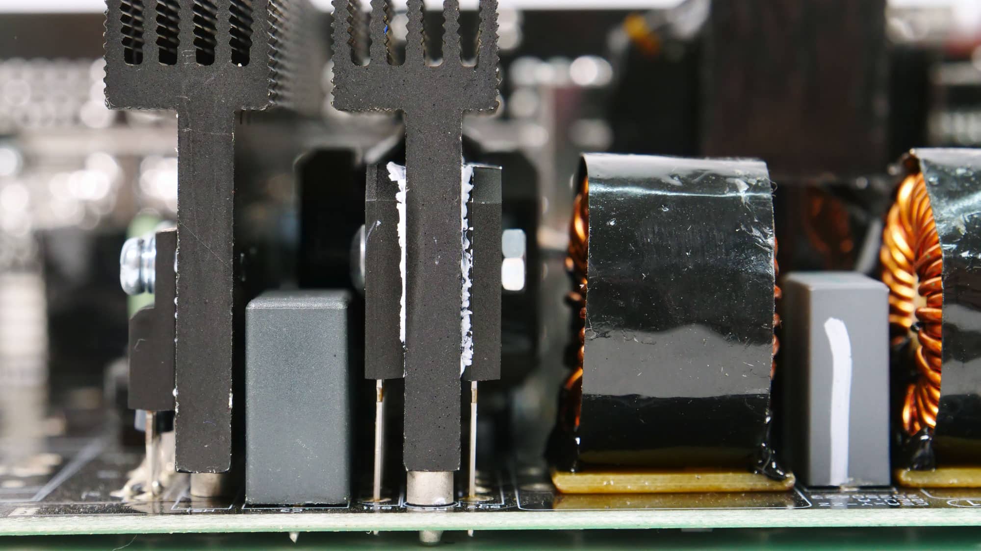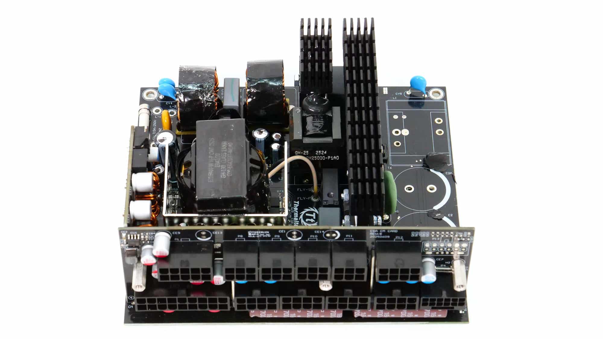 This is the same platform used in the PT 1200 model, with some component changes due to the lower maximum power output. CWT provides the platform, featuring a contemporary design with a full-bridge topology on the primary side and an LLC resonant converter for reduced energy losses. The PCB is compact, and to keep the parts cool without overspinning the fan, CWT used large heatsinks on the primary side. Typically, for a CWT design, the heatsinks on the secondary side are way smaller. Basically, the secondary’s side heatsink is a plate surrounding three sides of the main transformer, providing cooling and acting as a common-mode EMI shield. The same aluminum cover of the main transformer also offers limited high-frequency magnetic shielding.