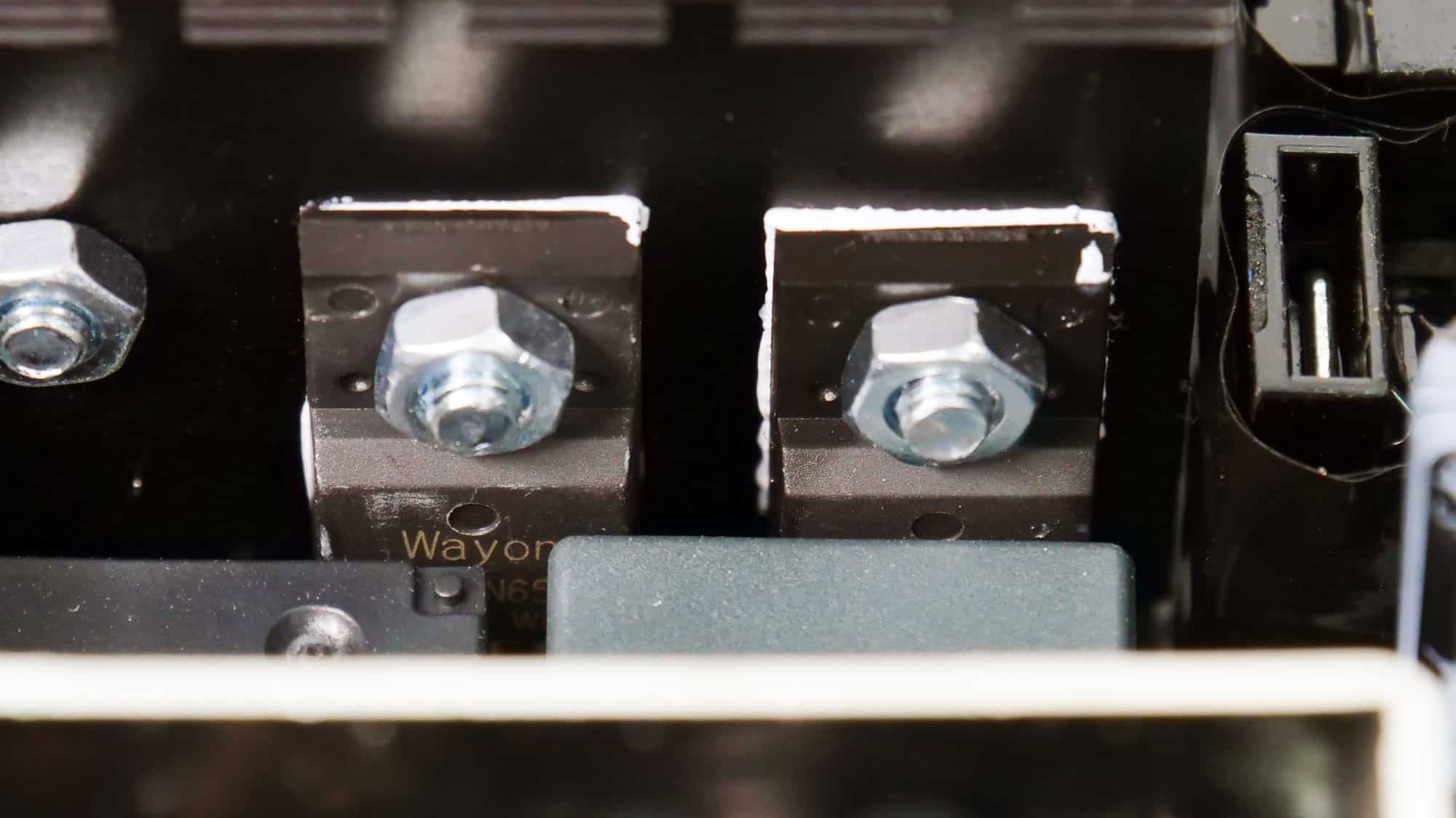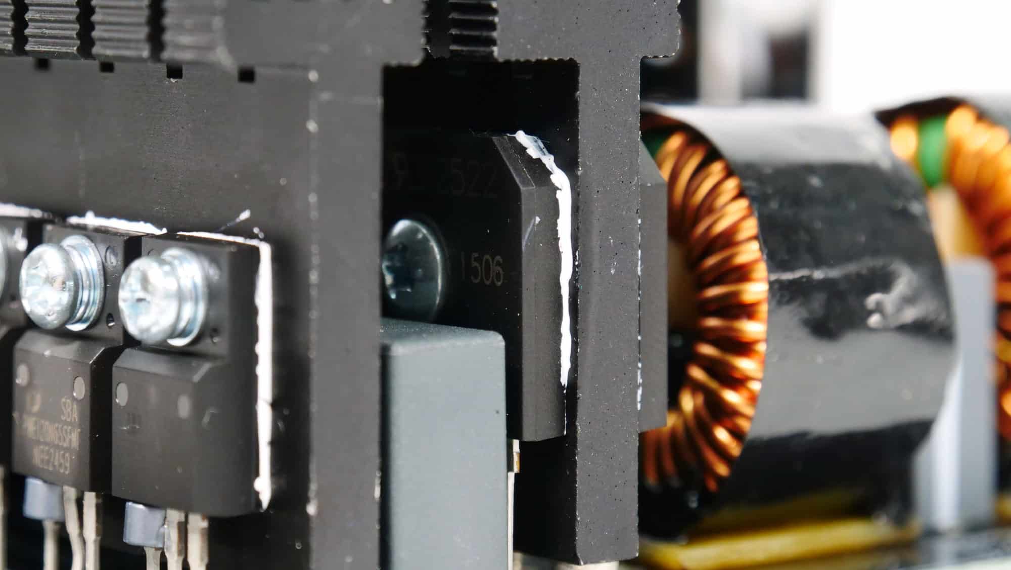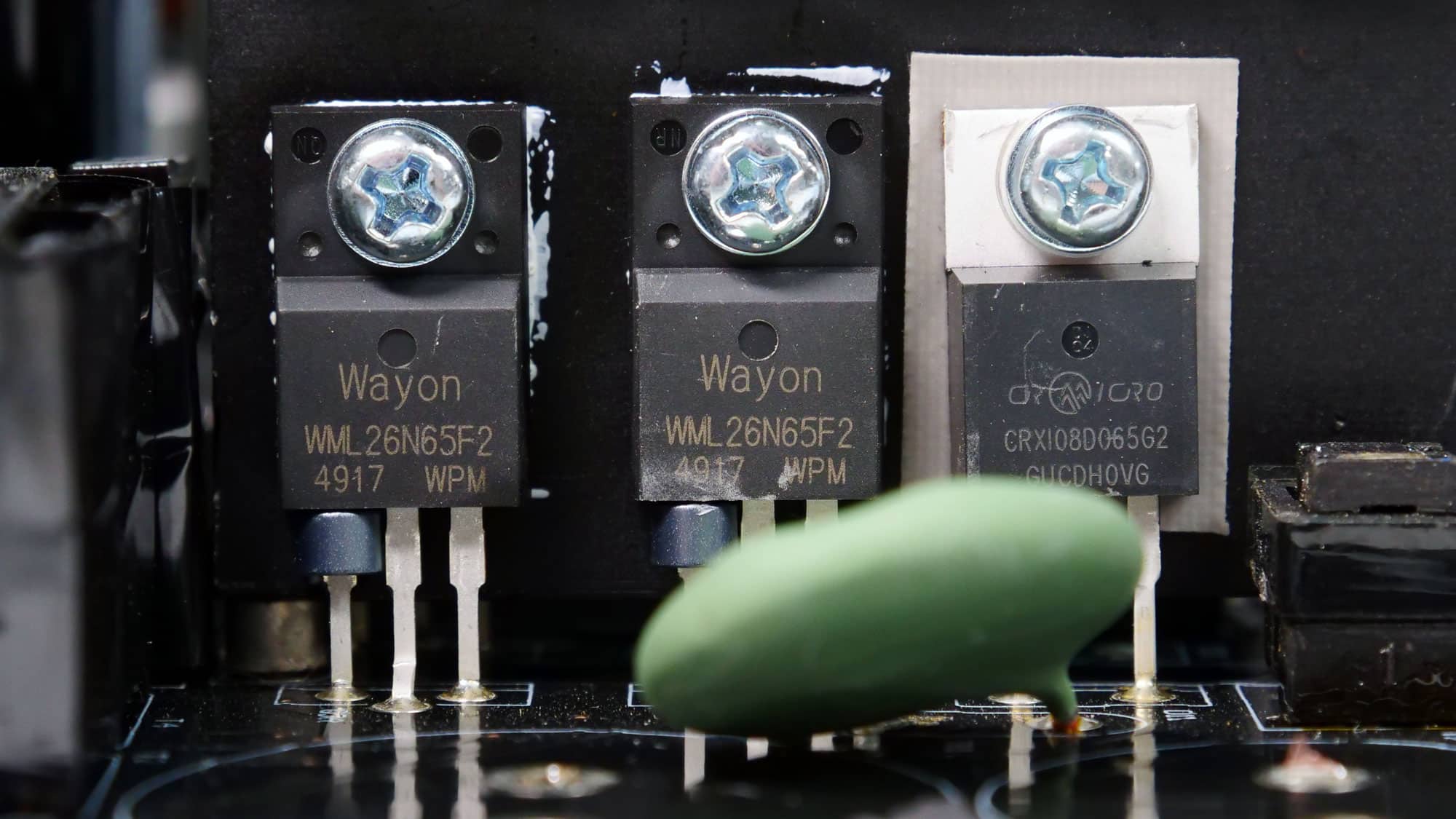 The APFC converter uses three PingWei PWE120N65SFMF FETs and a single CRMicro CRXI08D065G2 boost diode. Rubycon manufactures the bulk capacitors. Their combined capacity is 780 μF, and both are rated for 2,000 hours at 105 °C. The voltage rating is 400V, which is pretty close to the APFC’s DC bus voltage (approximately 380-400V DC). It would be better to use 420V-rated bulk caps or ideally 450V.
