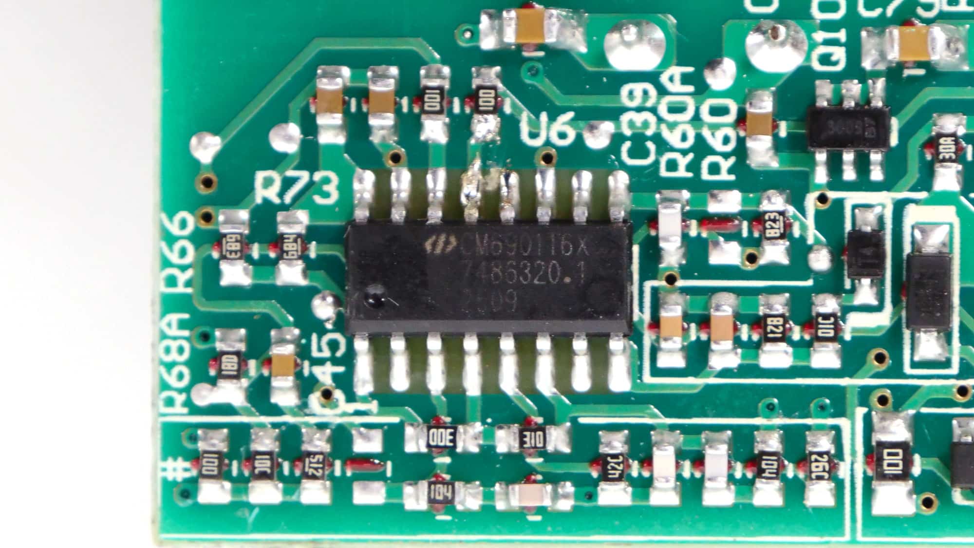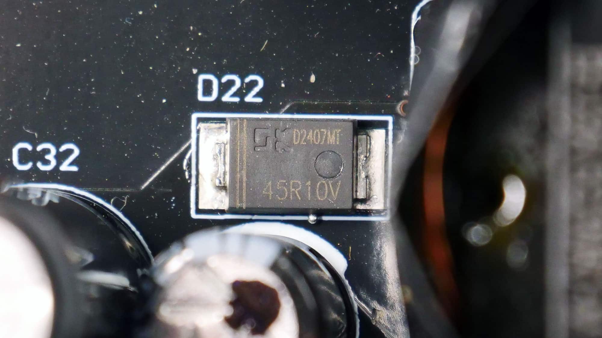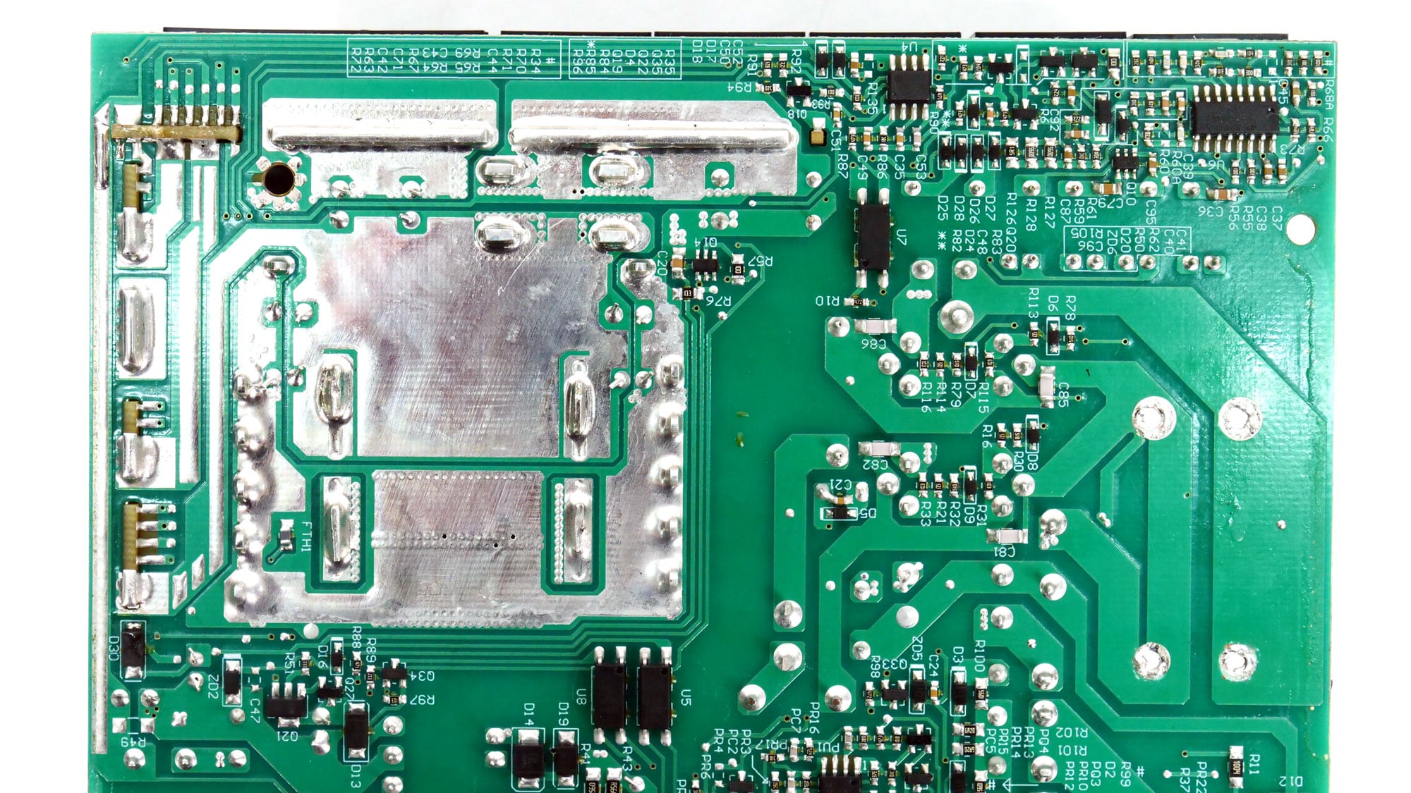 The APFC converter uses three PingWei PWE120N65SFMF FETs and a single CRMicro CRXI08D065G2 boost diode. Rubycon manufactures the bulk capacitors. Their combined capacity is 780 μF, and both are rated for 2,000 hours at 105 °C. The voltage rating is 400V, which is pretty close to the APFC’s DC bus voltage (approximately 380-400V DC). It would be better to use 420V-rated bulk caps or ideally 450V.