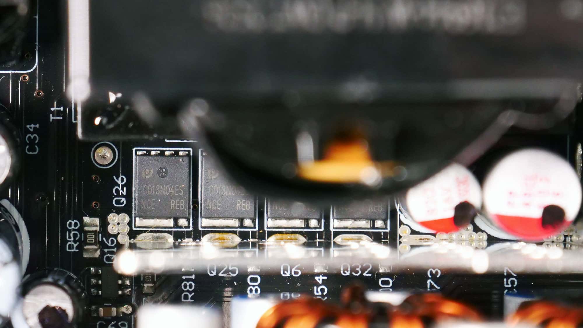 Eight PingWei PWC013N04ES FETs regulate the 12V rail. They are installed on the business (top) side of the PCB. The same type and number of FETs are installed in the 1200W model!