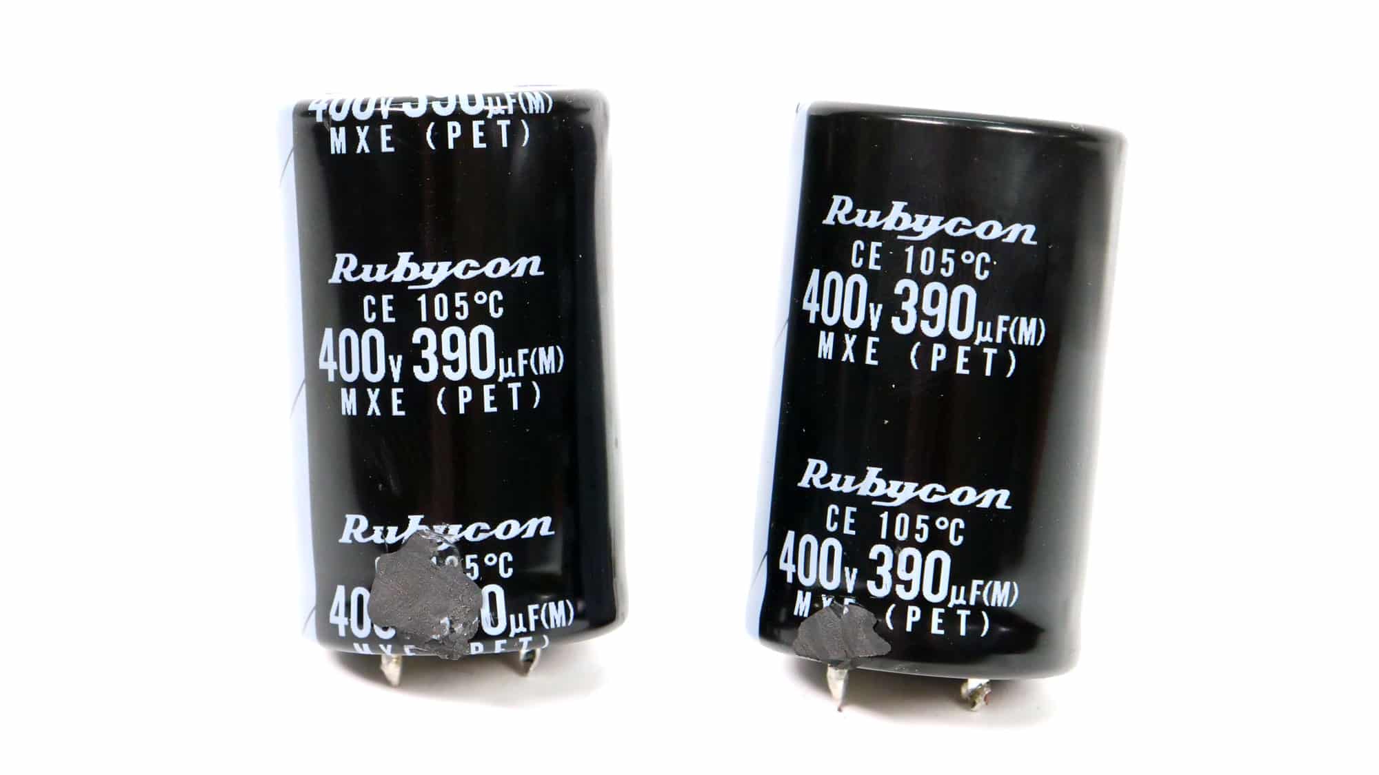 2x Rubycon (400V, 390uF each or 780uF combined, 2000h @ 105°C, MXE)
