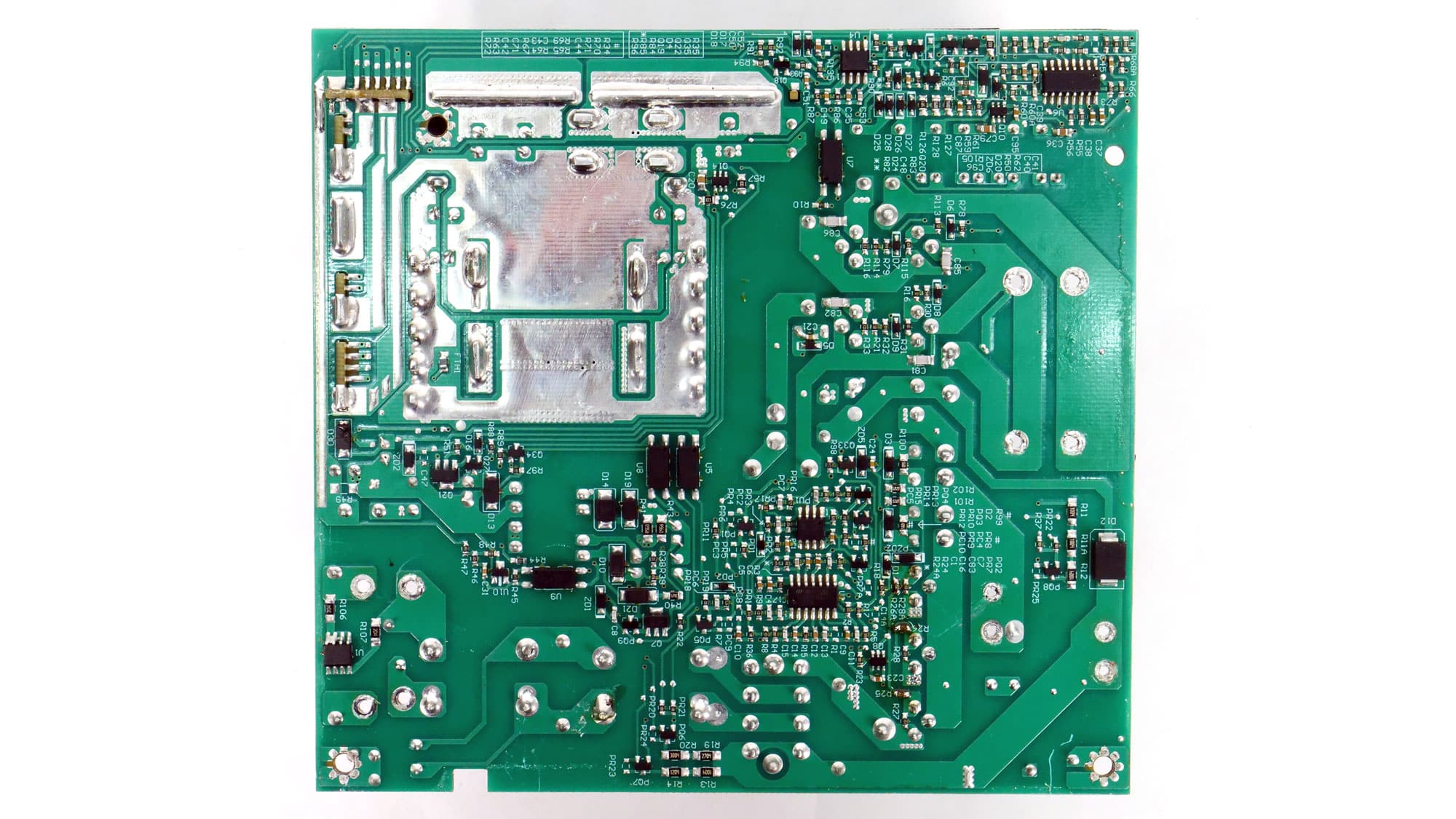 The transient filtering stage contains all the necessary components to block both incoming and outgoing EMI emissions. Typically, it starts at the AC receptacle and continues on the main PCB. It also includes a discharge IC for its X caps to provide a slight efficiency boost.