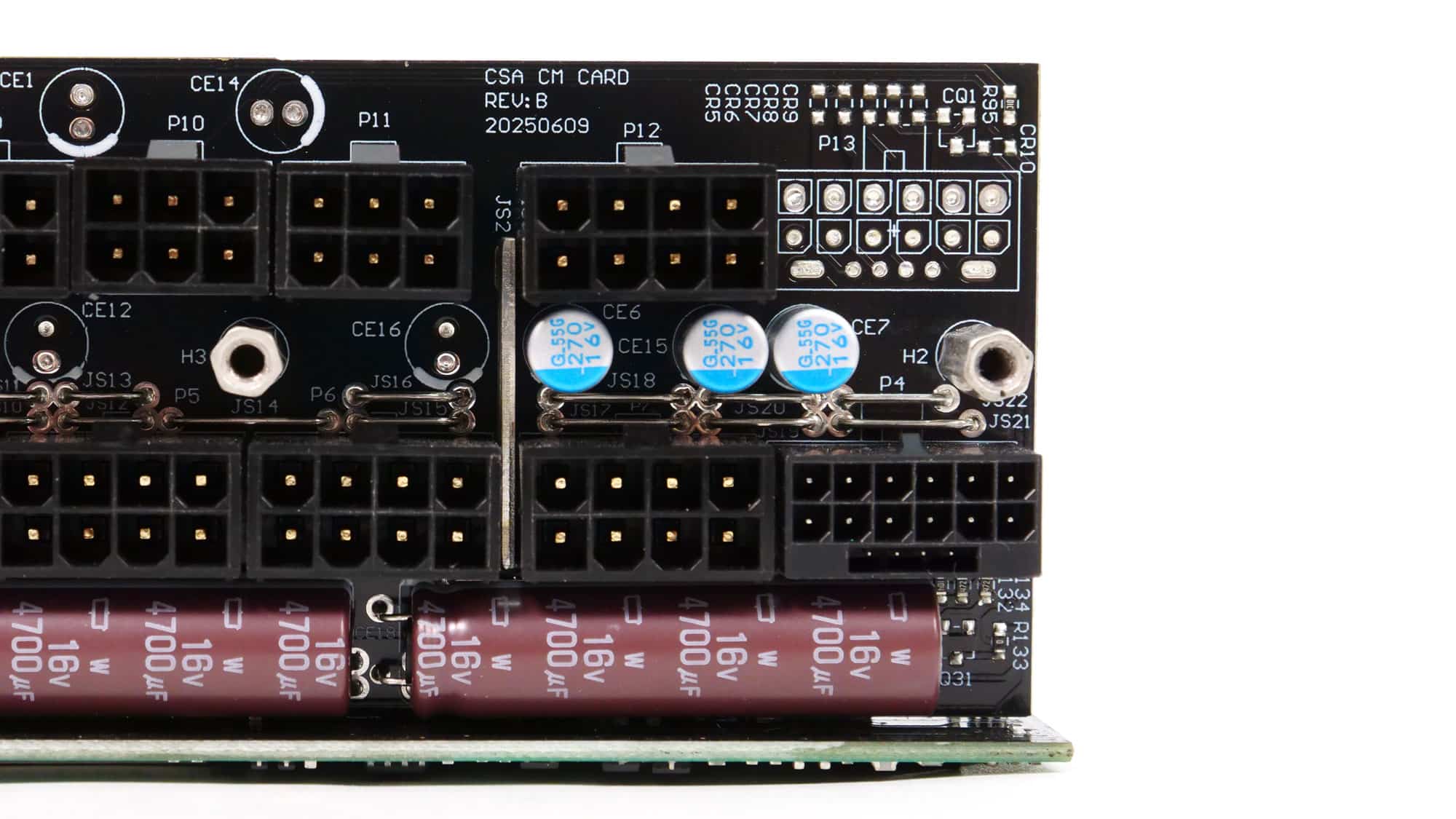 Several polymers and two big electrolytic caps on the face of the modular panel form an extra ripple-filtering layer.