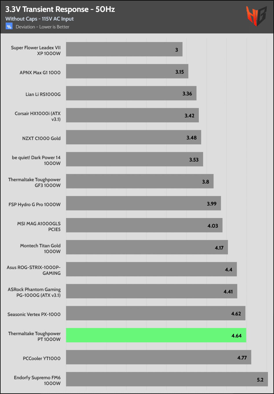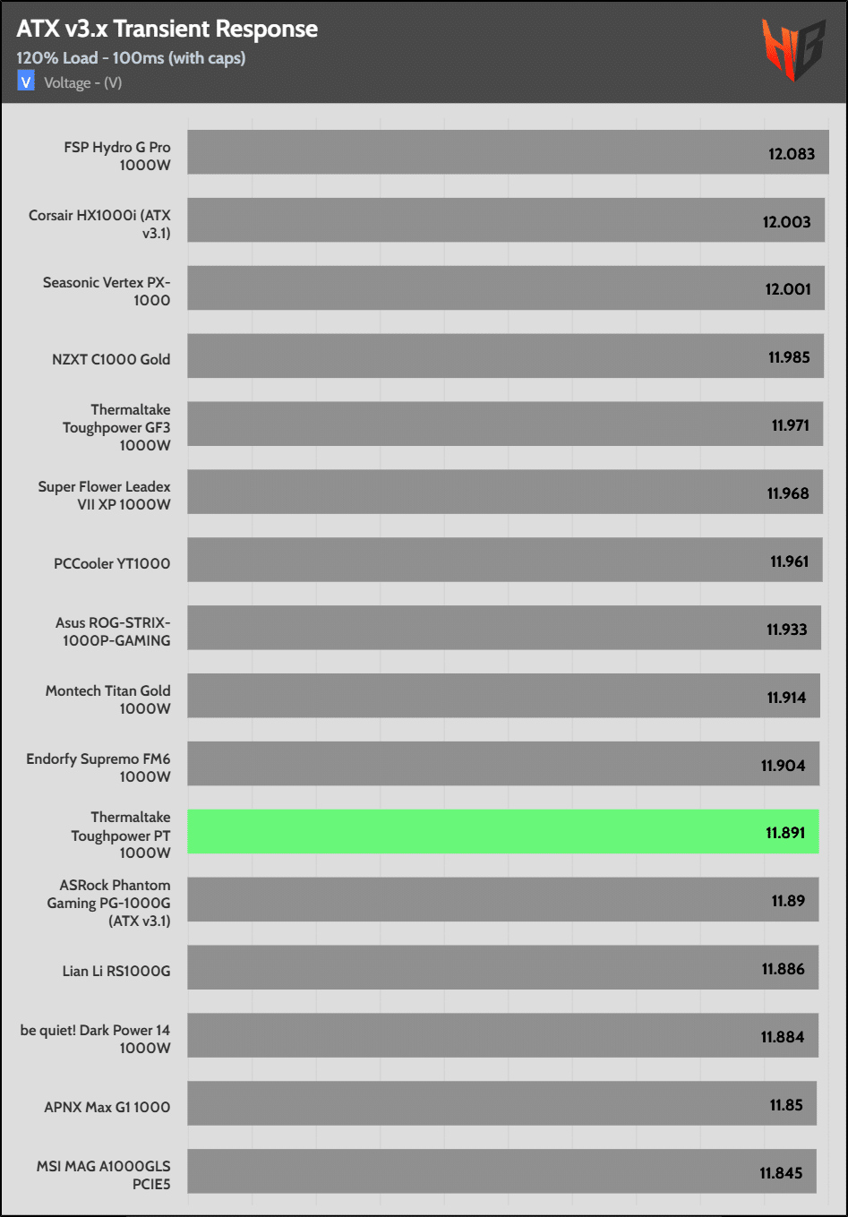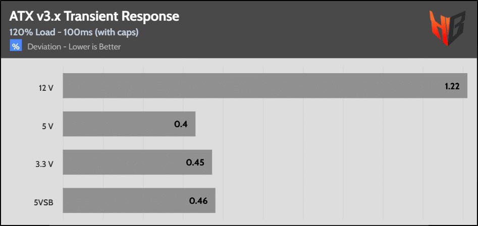 The transient response with normal loads is good at 12V, decent at 5V, and mediocre at 3.3V, where the voltage level drops below 3.2V. That said, it remains above the low limit (set by the ATX spec) of 3.14V, unlike the 1200W model.