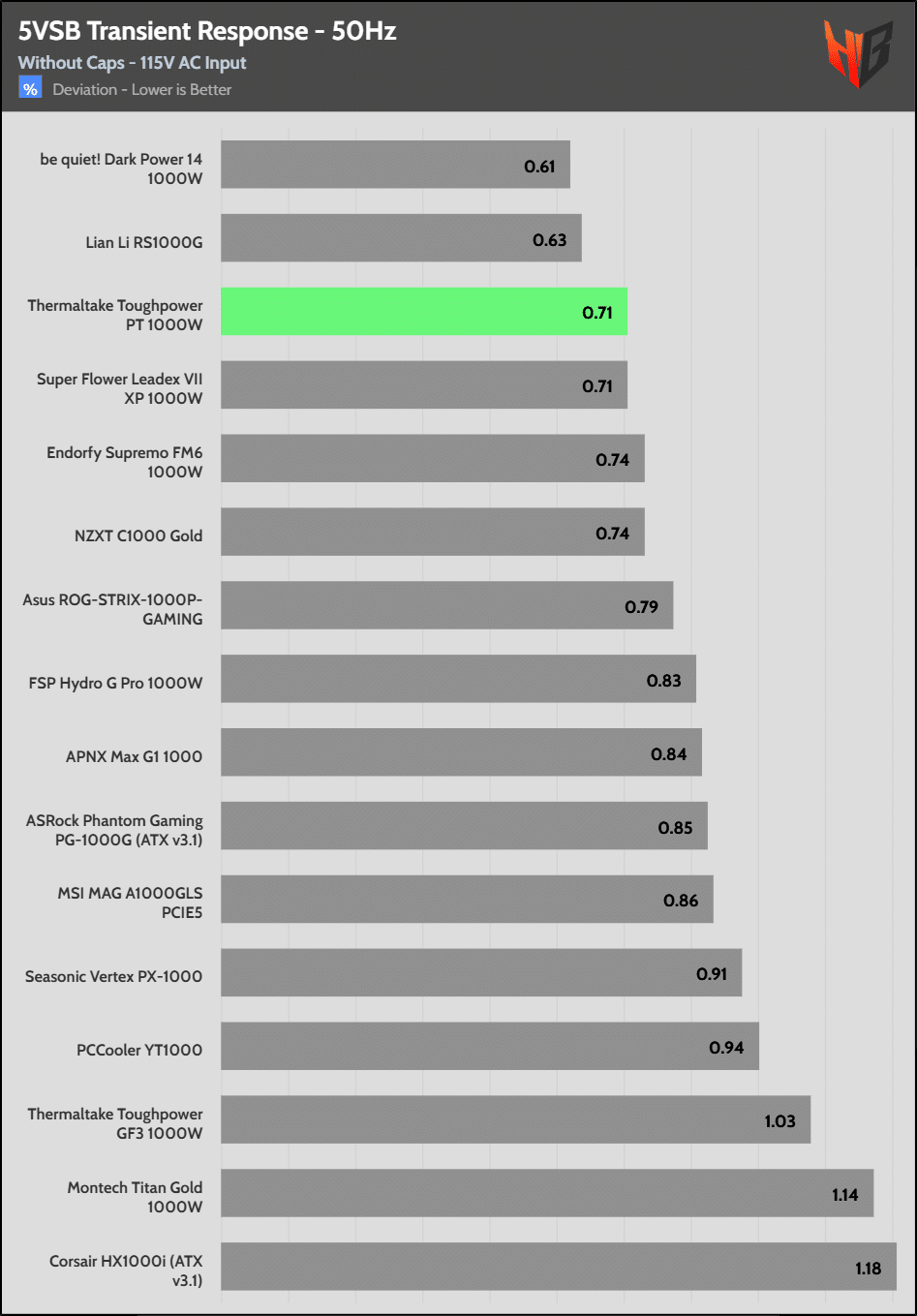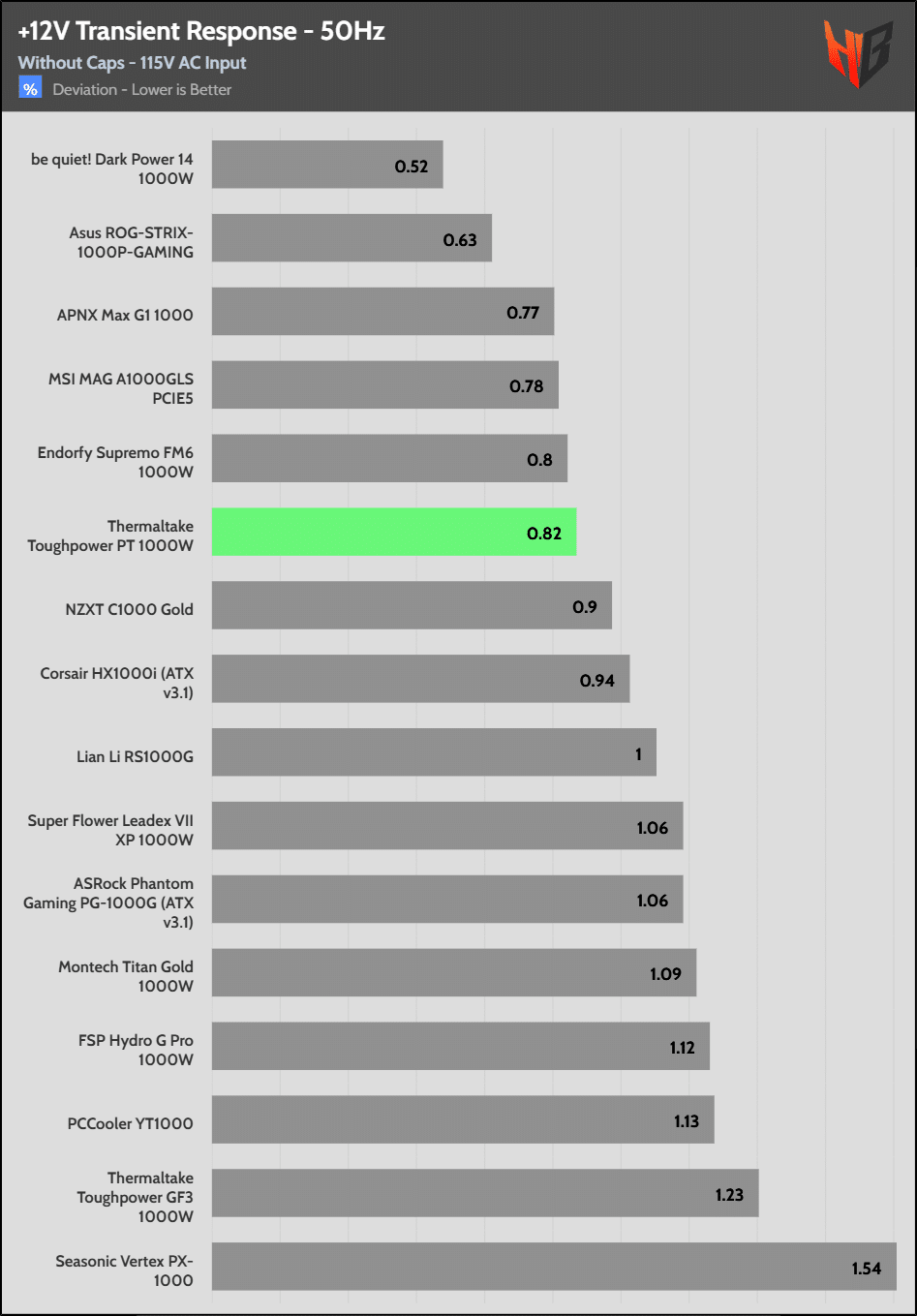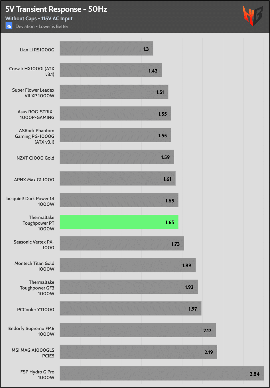 The transient response with normal loads is good at 12V, decent at 5V, and mediocre at 3.3V, where the voltage level drops below 3.2V. That said, it remains above the low limit (set by the ATX spec) of 3.14V, unlike the 1200W model.