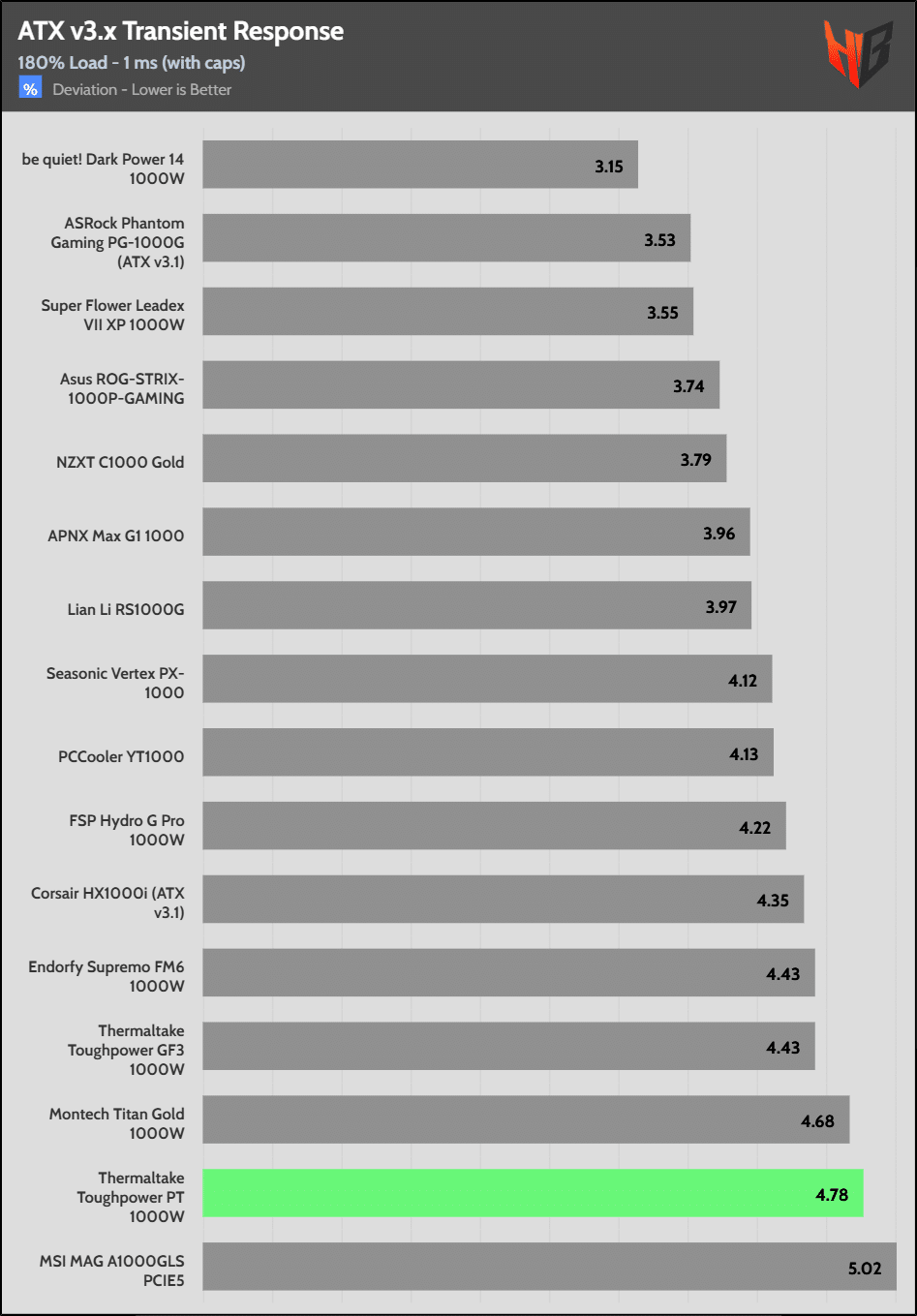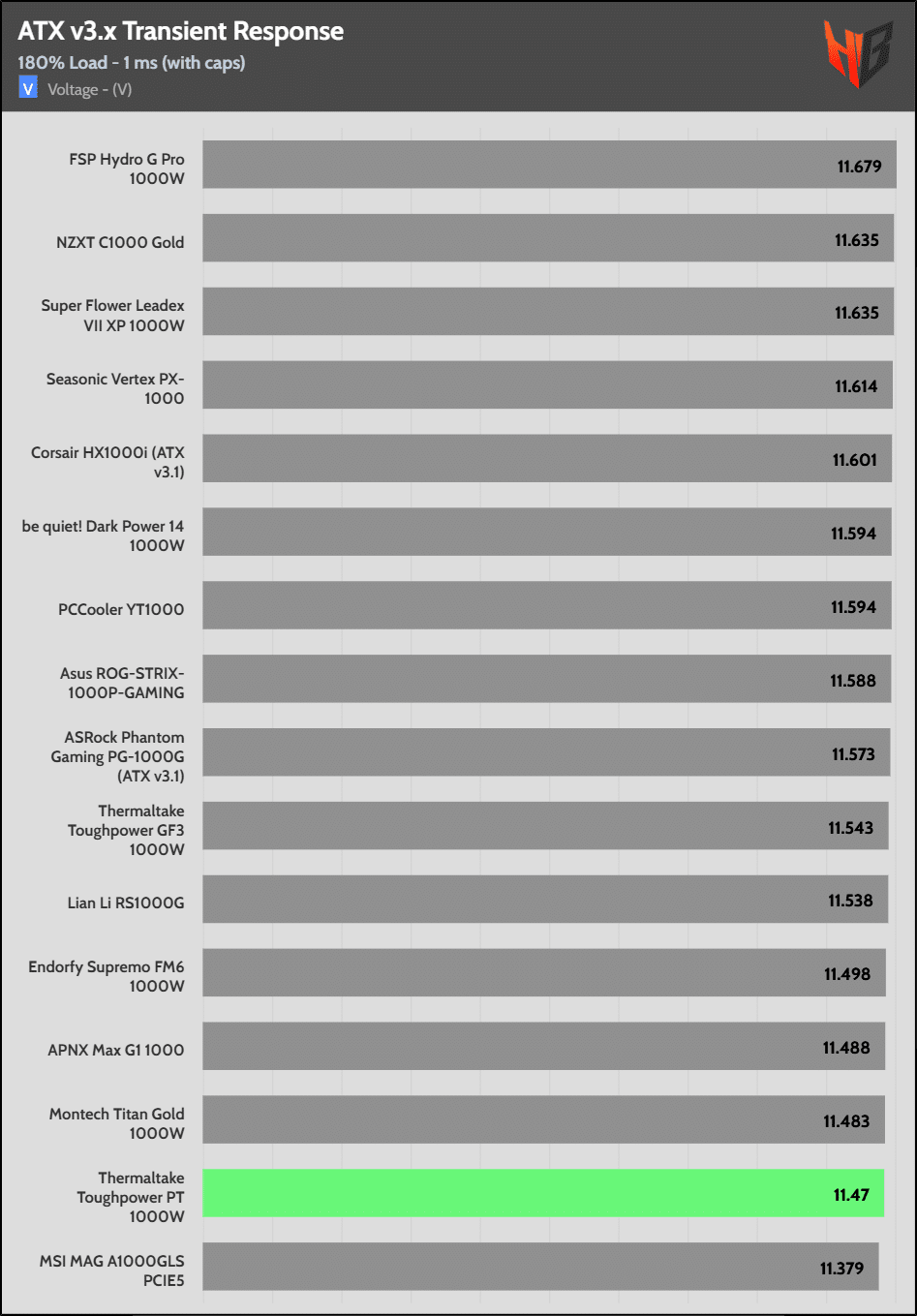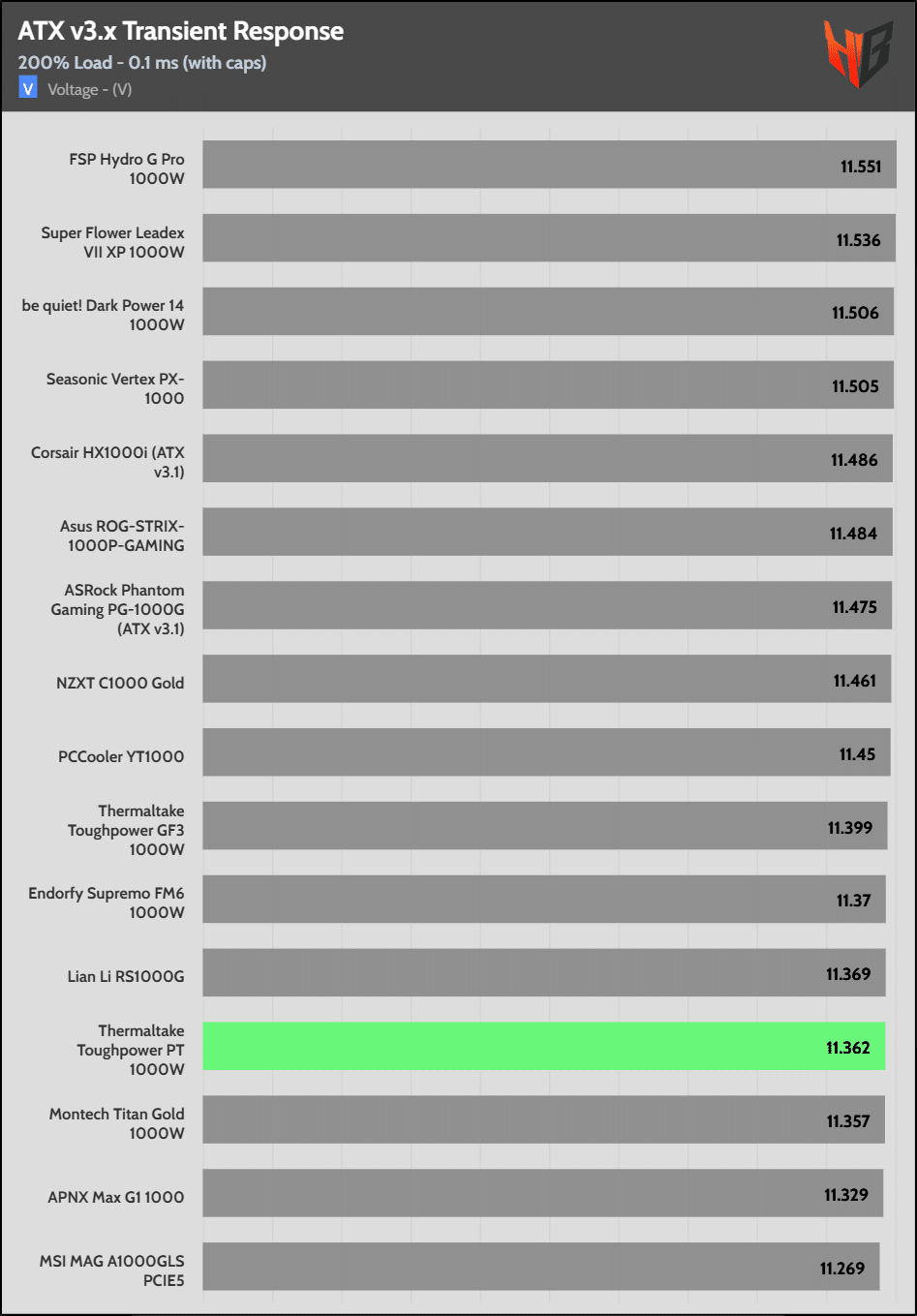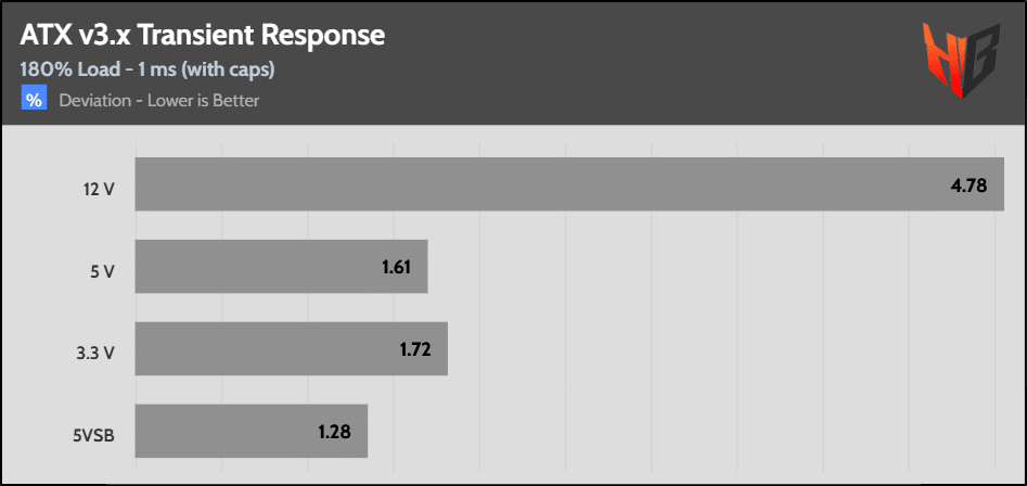 [Note] For PSUs without a 12+4 pin connector, the maximum applied load for the transient response tests is 150%, rather than 200%.The PSU passes all ATX v3.1 transient response tests.
