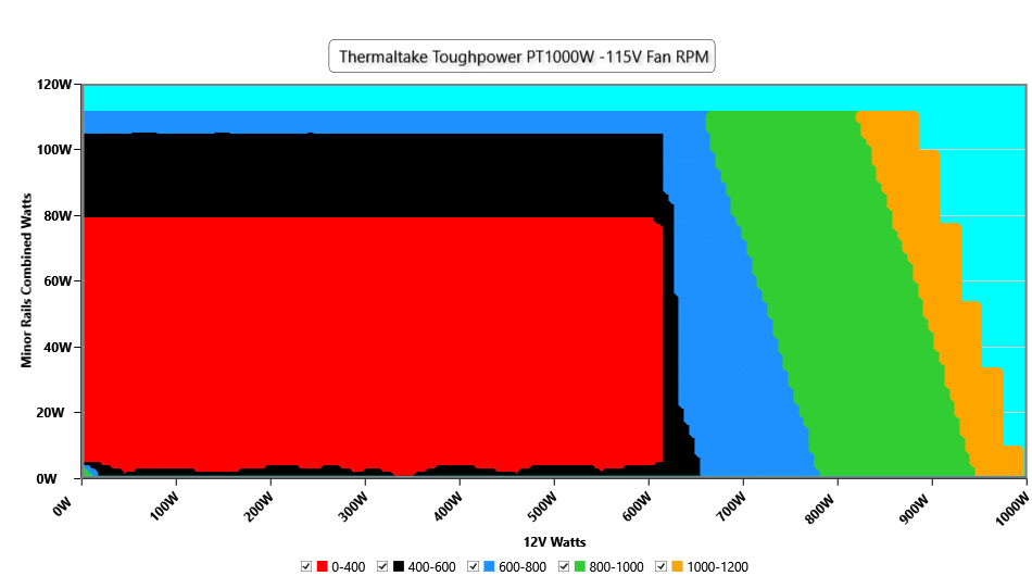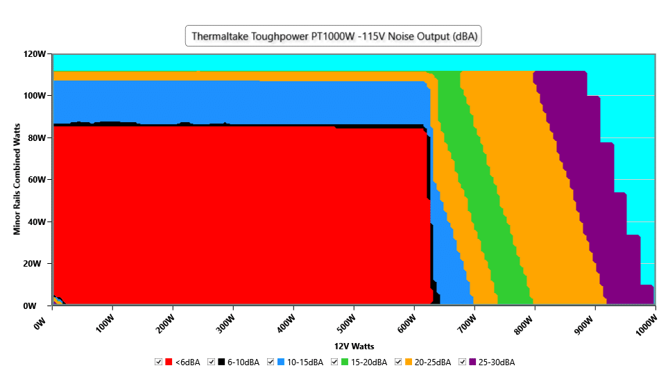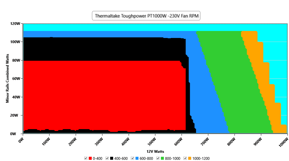 The fan’s close-to-400-RPM operation lasts for a long time when the combined load on the minor rails remains below 85W. With more than 700W at 12V, the noise exceeds 20 dBA, then drops below that for a short operational period to 15-20 dBA before rising again at around 920W @ 12V, above 25 dBA. All in all, the fan speed profile is highly relaxed.