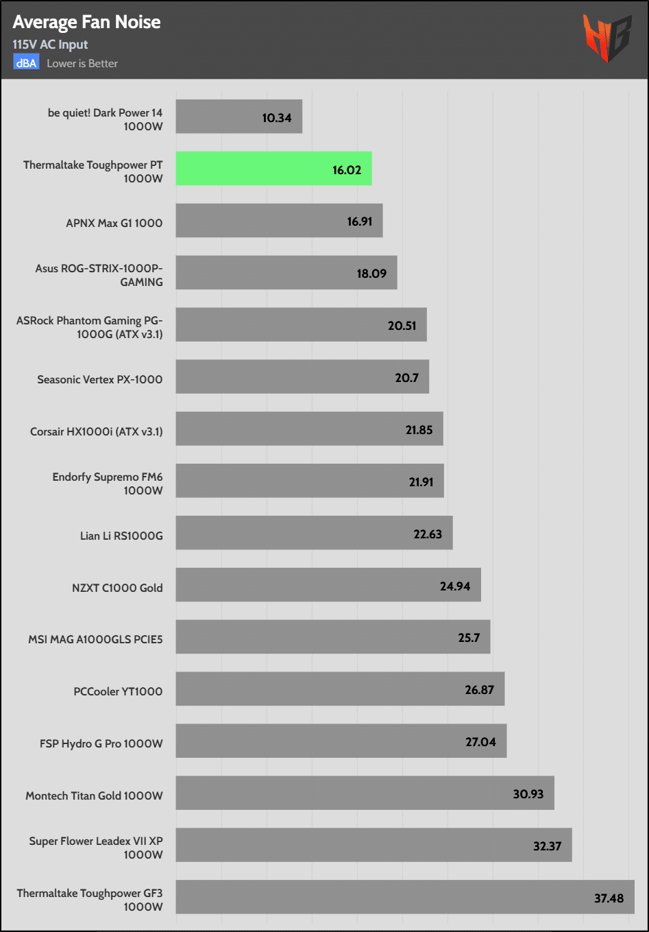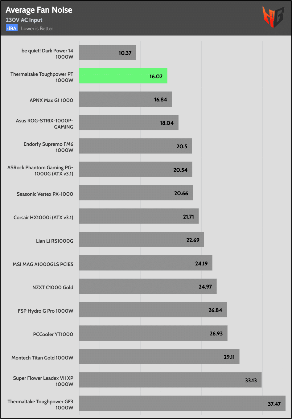 The PSU’s average noise output is among the lowest in the 1000W category.