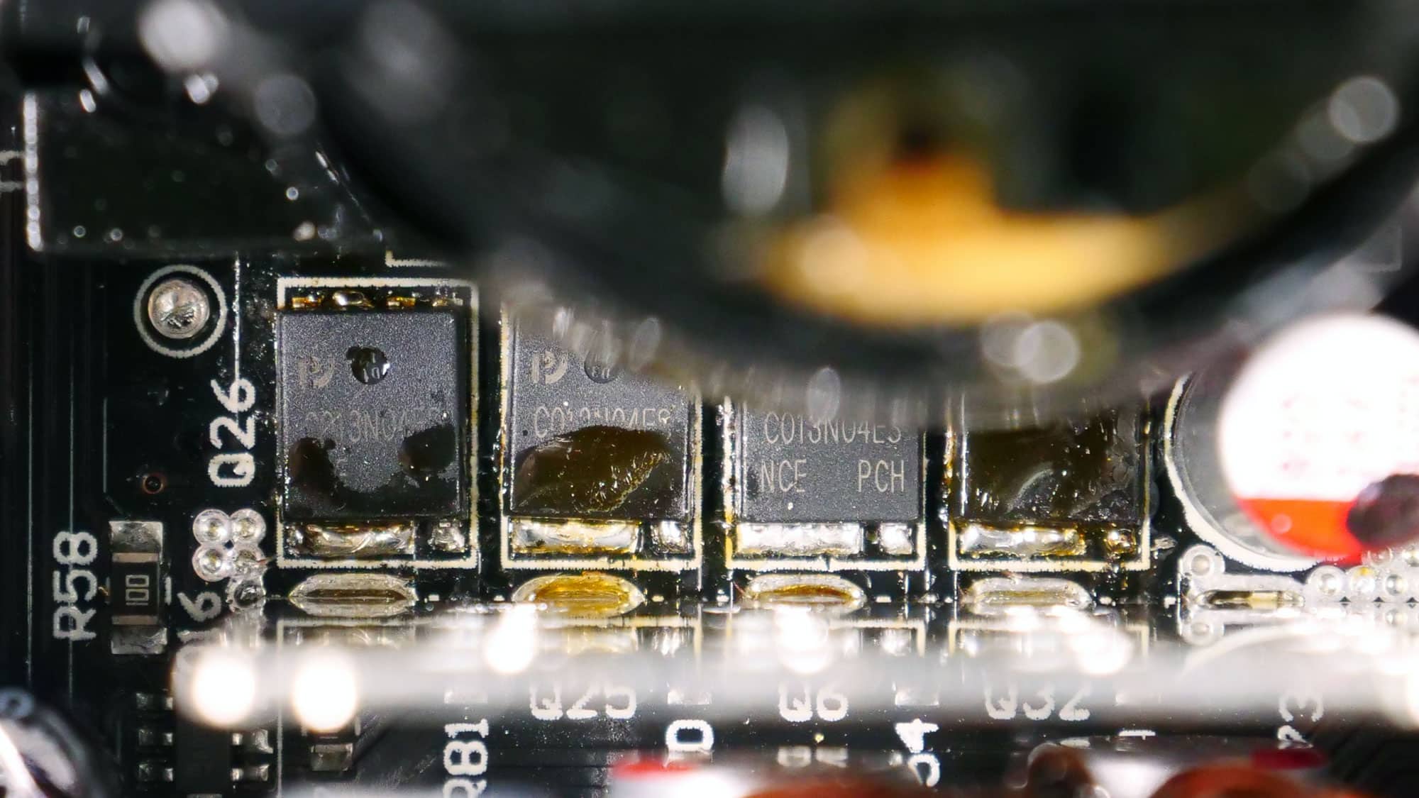 Eight PingWei PWC013N04ES FETs regulate the 12V rail. They are installed on the business (top) side of the PCB.
