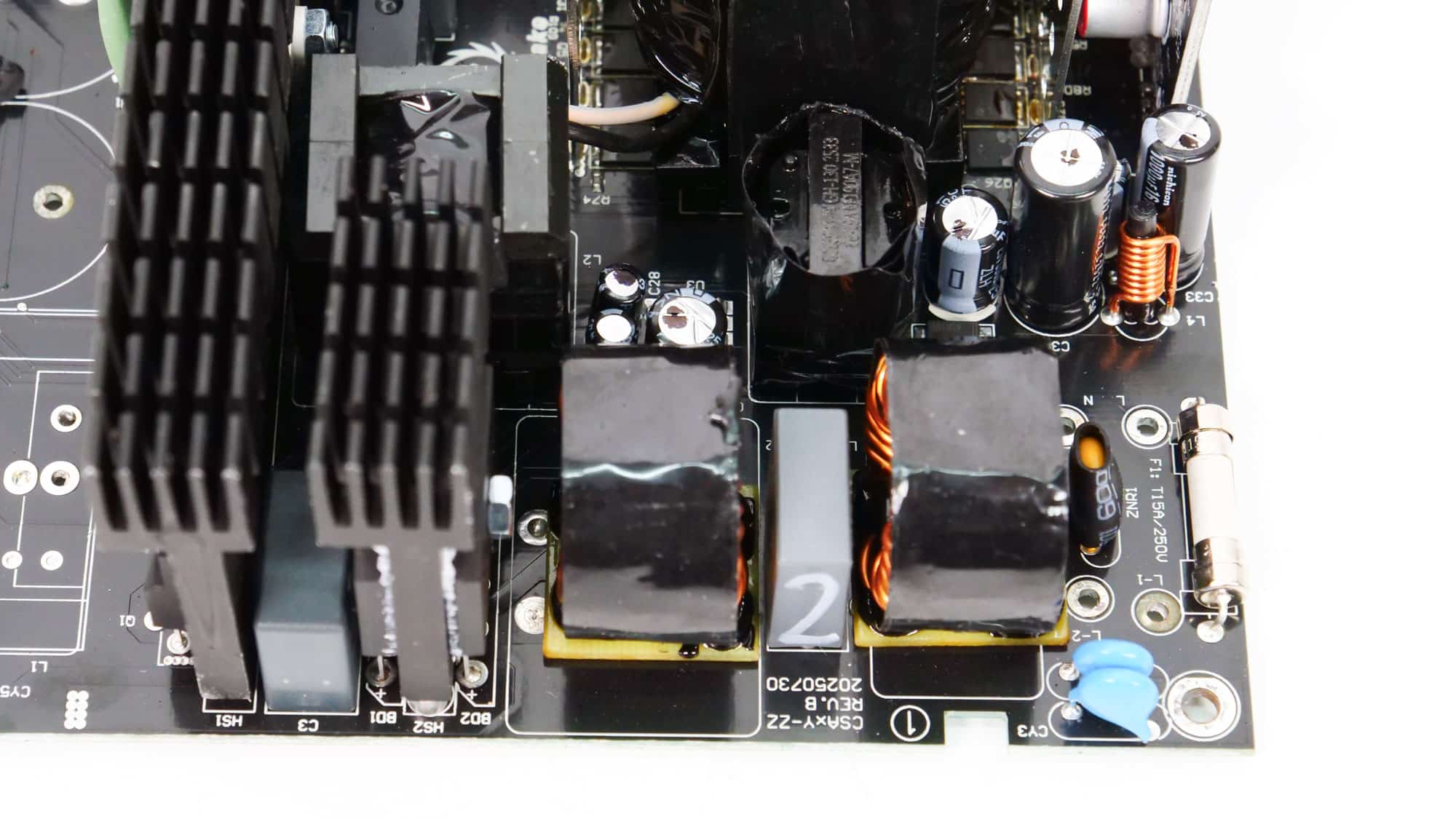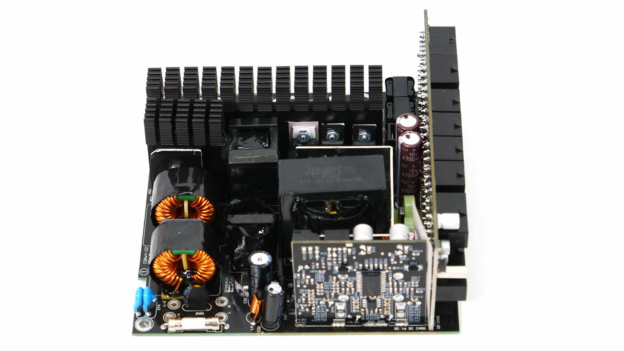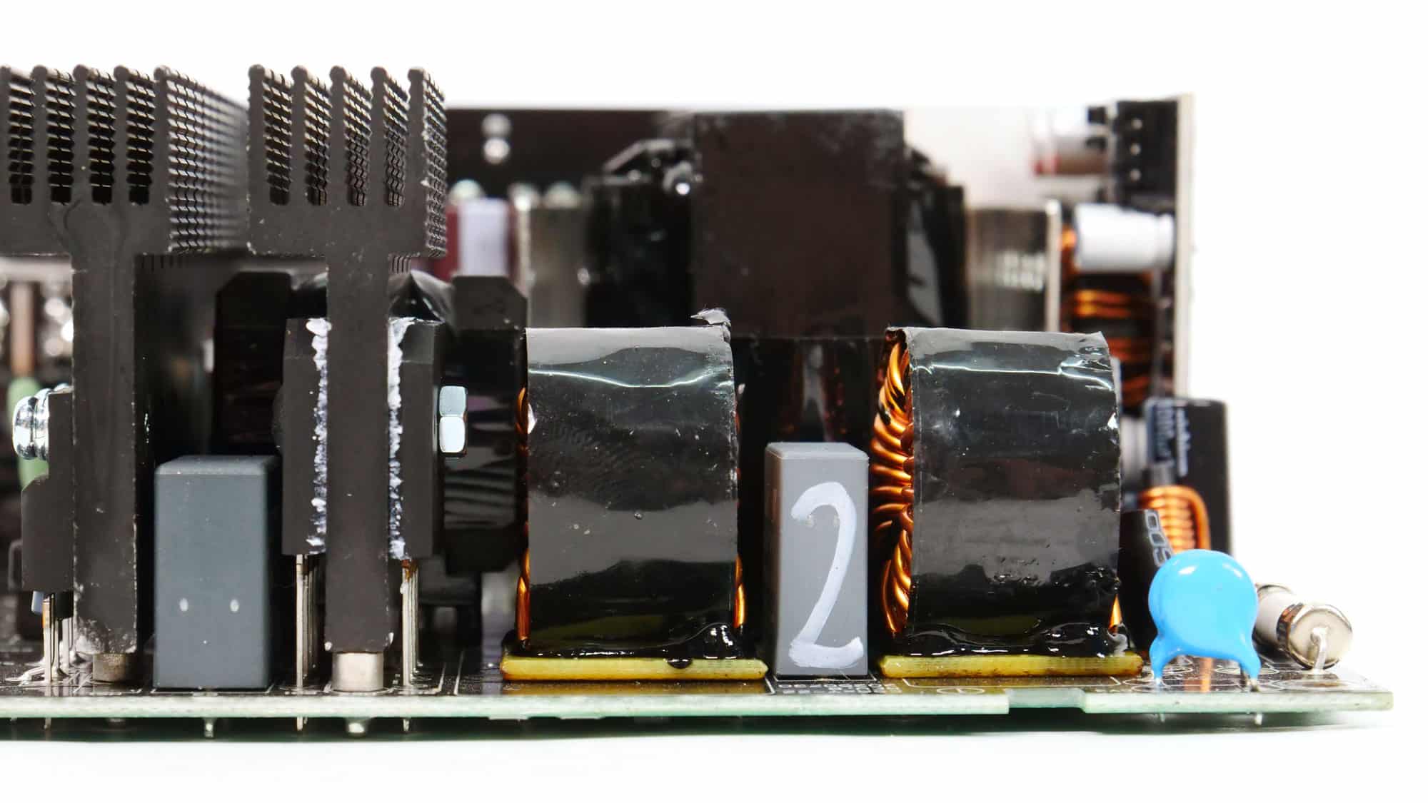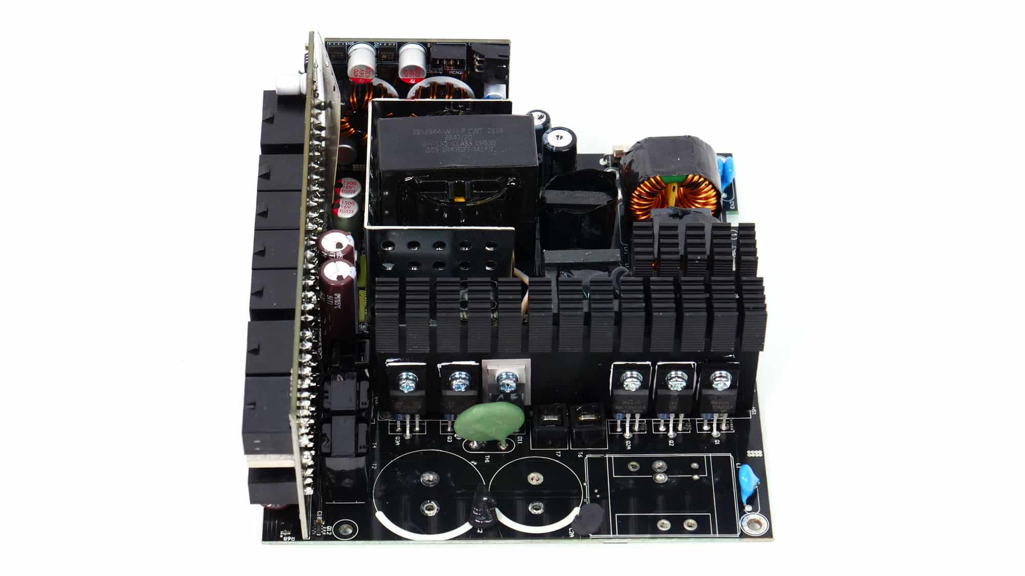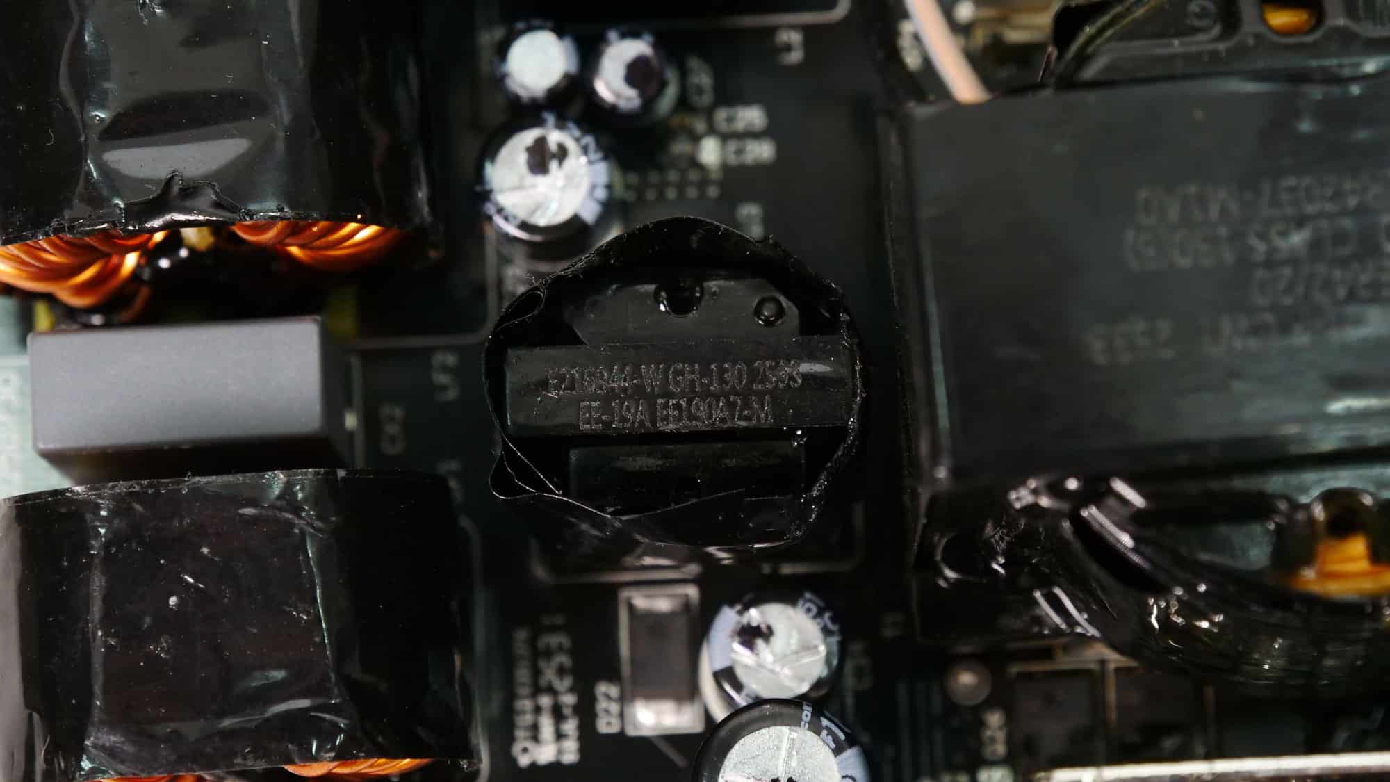 CWT provides the platform, featuring a contemporary design with a full-bridge topology on the primary side and an LLC resonant converter for reduced energy losses. The PCB is tiny for a 1200W unit, and to keep the parts cool without overspinning the fan, CWT used large heatsinks on the primary side. Typically, for a CWT design, the heatsinks on the secondary side are way smaller. Basically, the secondary’s side heatsink is a plate surrounding three sides of the main transformer, providing cooling and acting as a common-mode EMI shield. The same aluminum cover of the main transformer also offers limited high-frequency magnetic shielding.