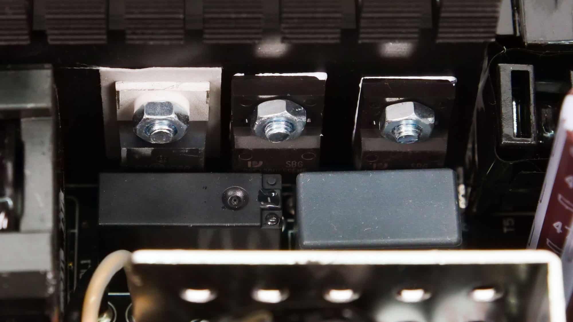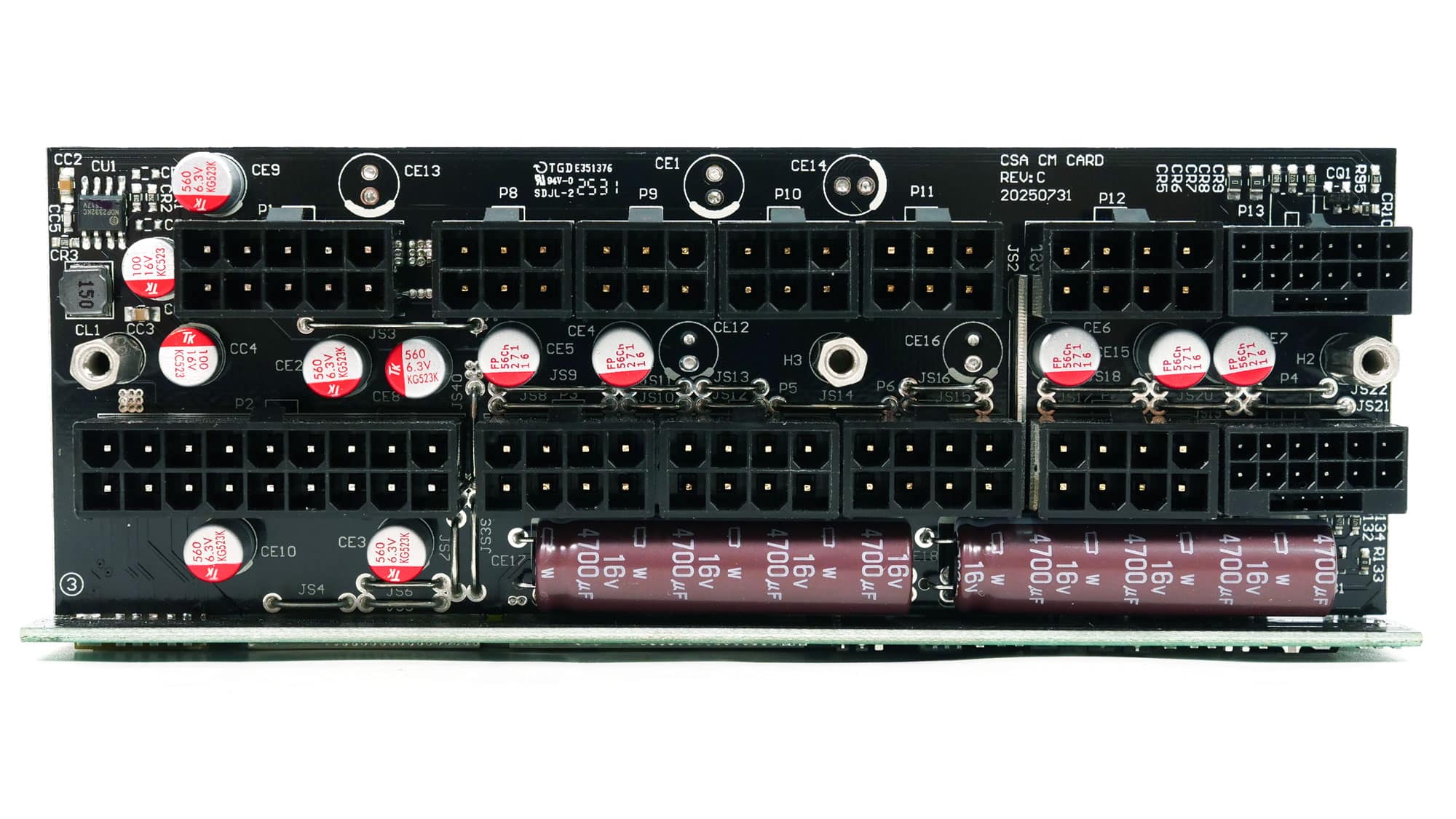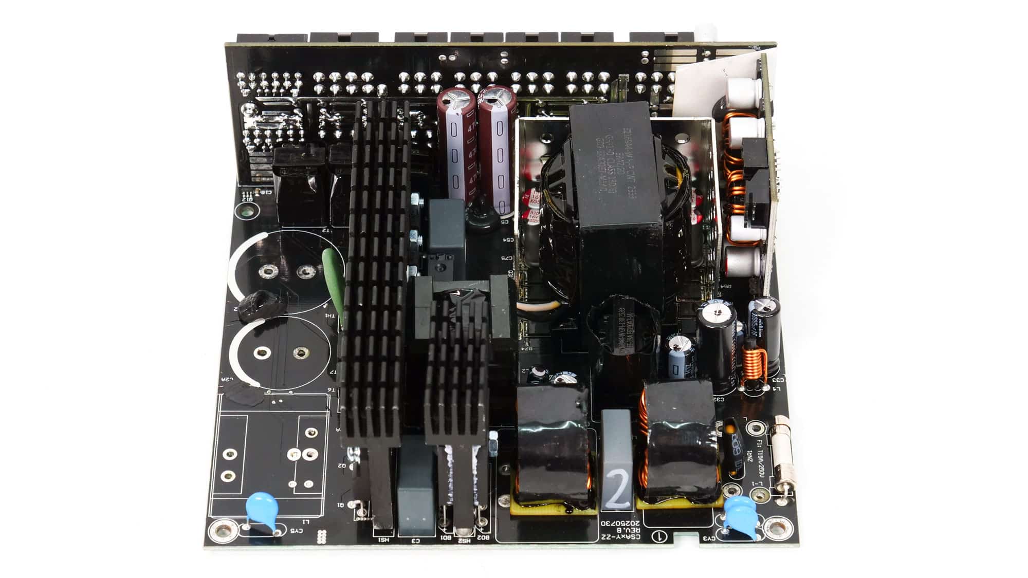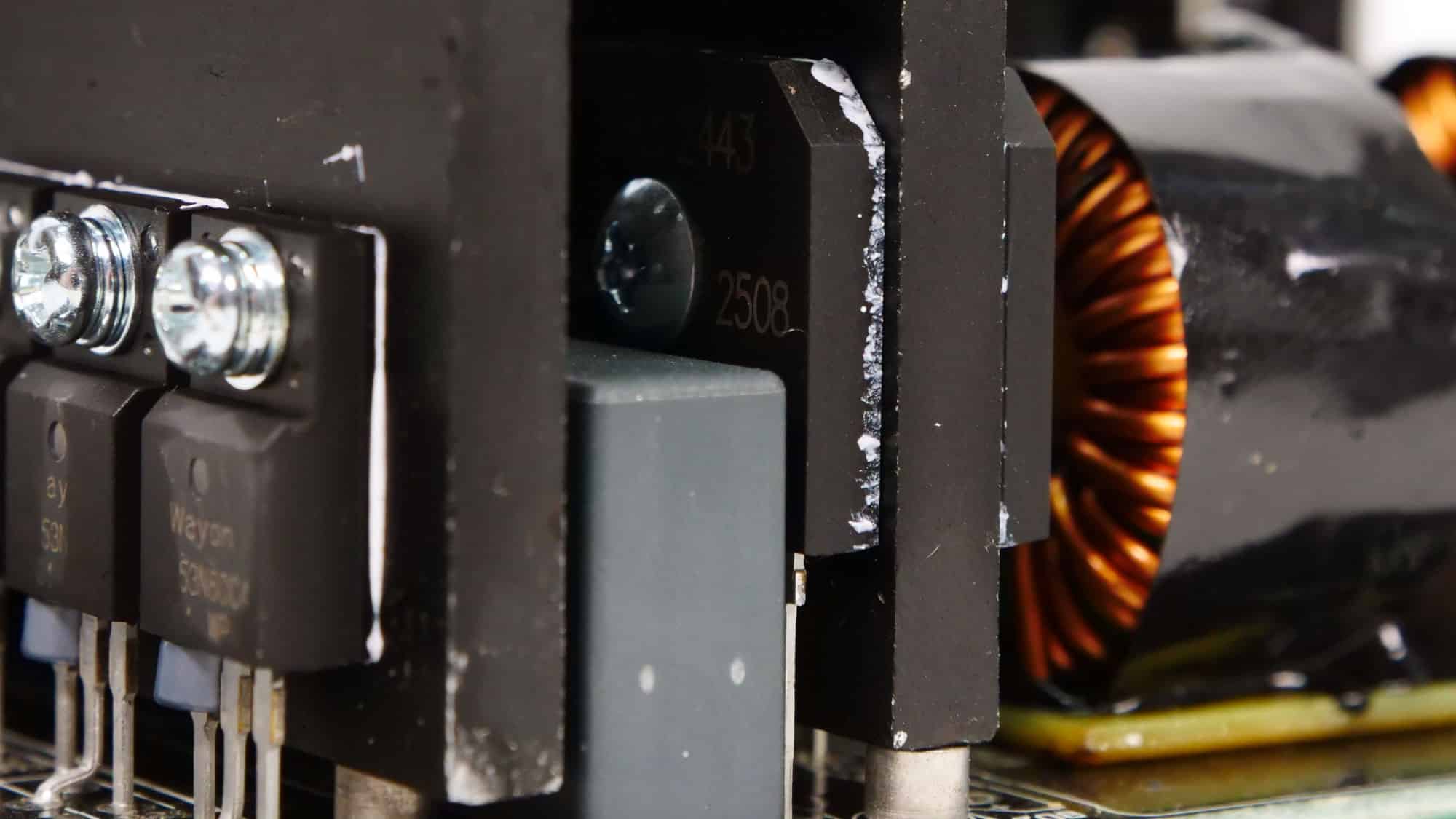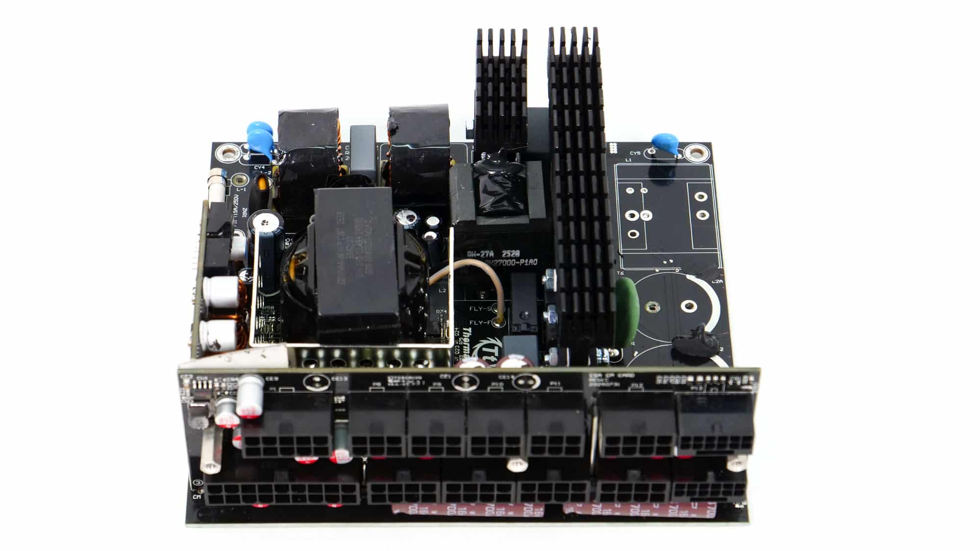 CWT provides the platform, featuring a contemporary design with a full-bridge topology on the primary side and an LLC resonant converter for reduced energy losses. The PCB is tiny for a 1200W unit, and to keep the parts cool without overspinning the fan, CWT used large heatsinks on the primary side. Typically, for a CWT design, the heatsinks on the secondary side are way smaller. Basically, the secondary’s side heatsink is a plate surrounding three sides of the main transformer, providing cooling and acting as a common-mode EMI shield. The same aluminum cover of the main transformer also offers limited high-frequency magnetic shielding.