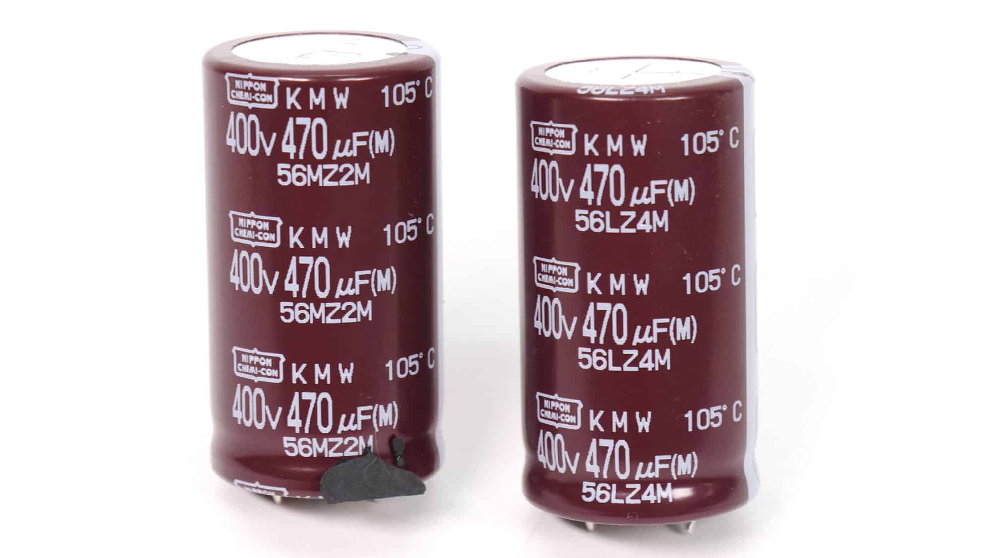 2x Nippon Chemi-Con (400V, 470uF each or 940uF combined, 2000h @ 105°C, KMW)