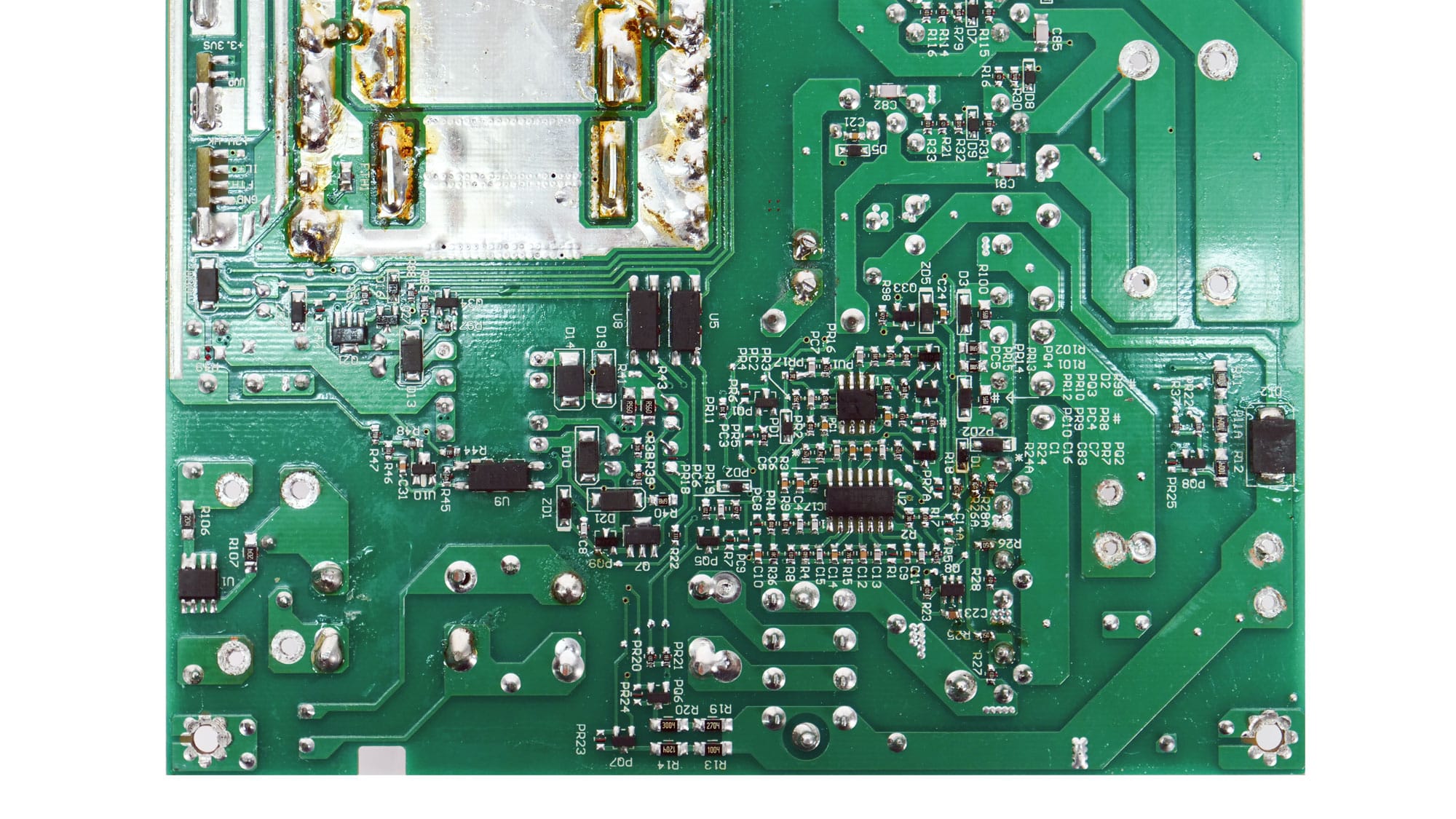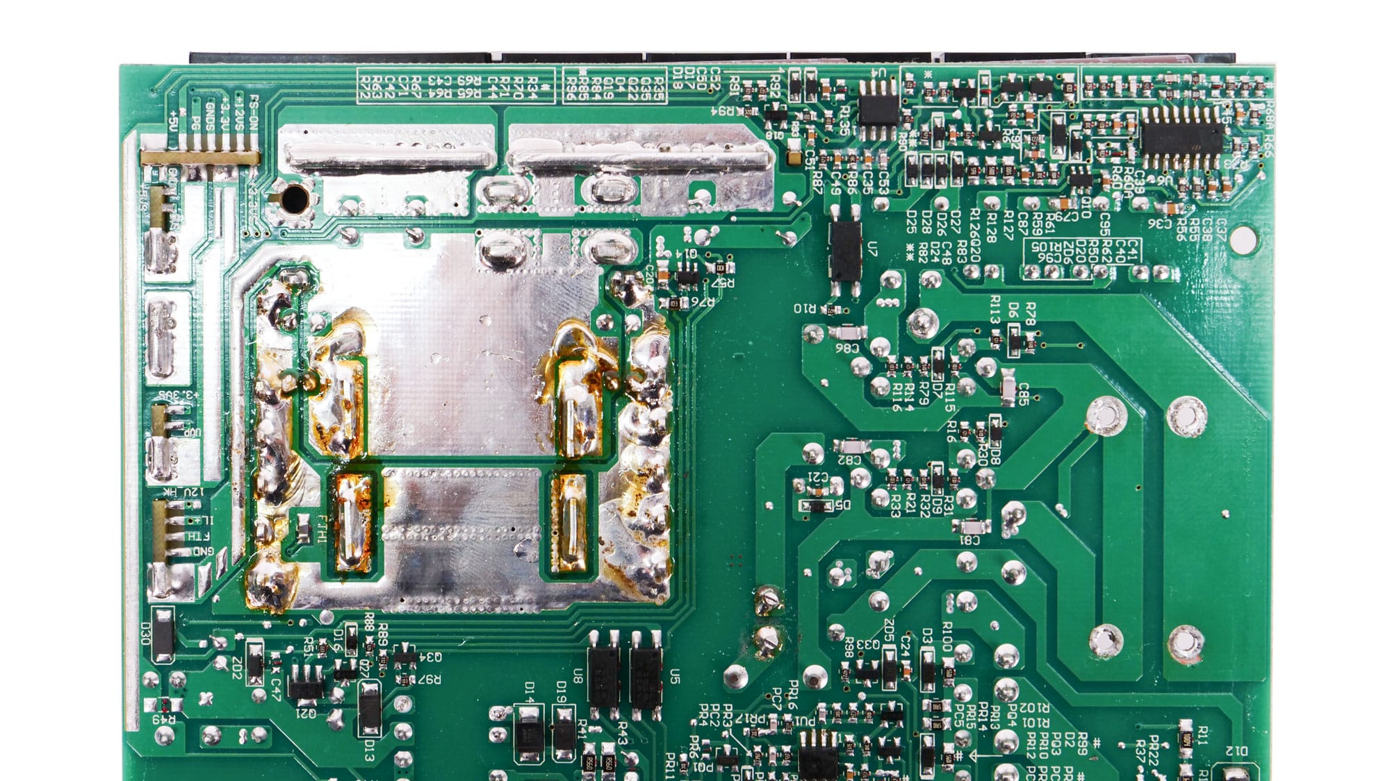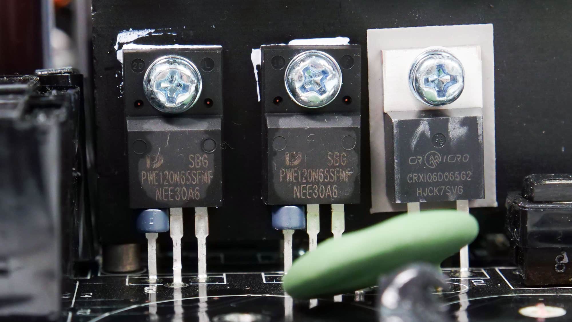 The APFC converter uses three Way-On WML53N60C4 FETs and two CRMicro CRXI06D065G2 boost diodes. Nippon Chemi-Con manufactures the bulk capacitors. Their combined capacity is 940 μF, and both are rated for 2,000 hours at 105 °C. The voltage rating is 400V, which is pretty close to the APFC’s DC bus voltage (approximately 380-400V DC). It would be better to use 420V-rated bulk caps or ideally 450V.