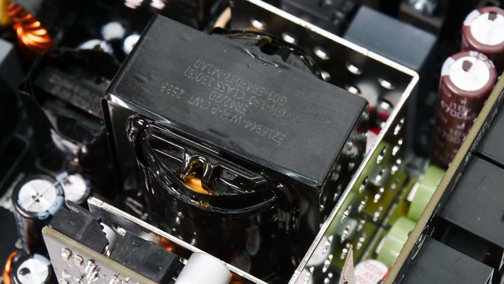 The PSU’s main transformer. One of its main functions is to electrically isolate the primary and secondary sides.