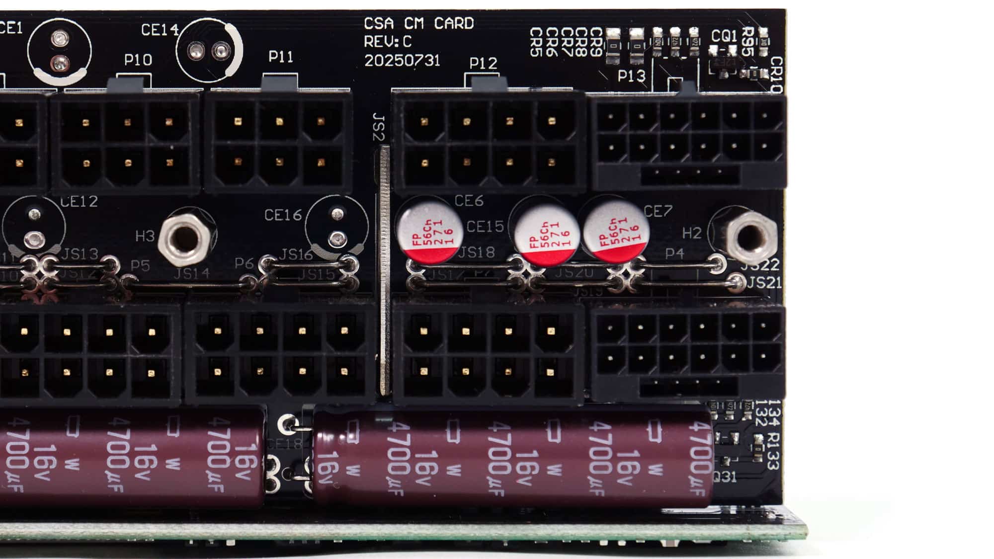 Several polymers and two big electrolytic caps on the face of the modular panel form an extra ripple-filtering layer.