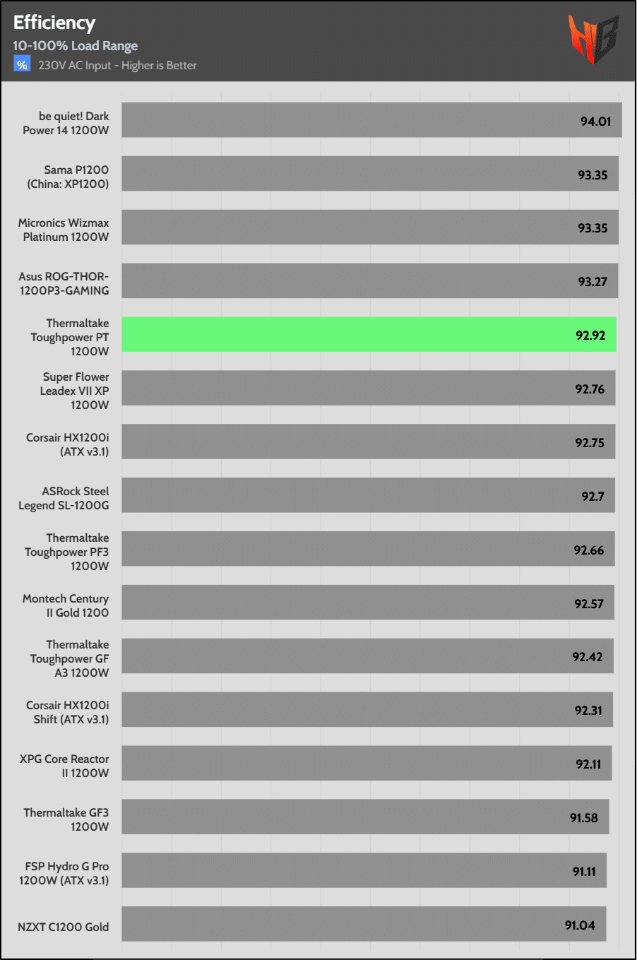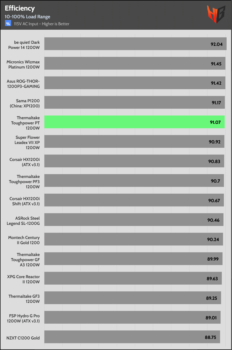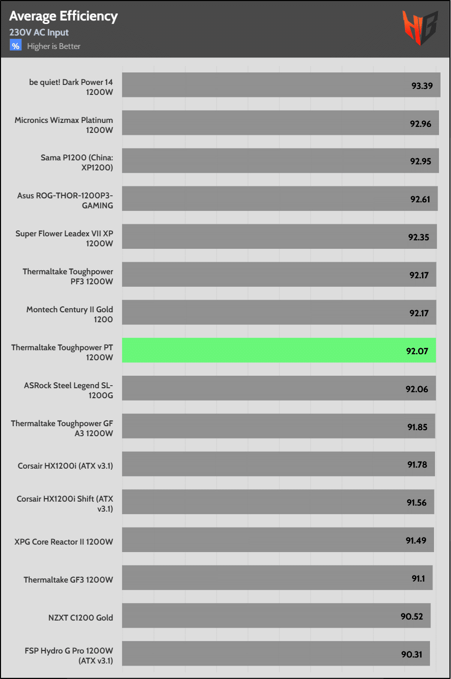 The PSU’s average efficiency with more than 1450 different load levels at 115V and 230V is depicted in the graphs below.