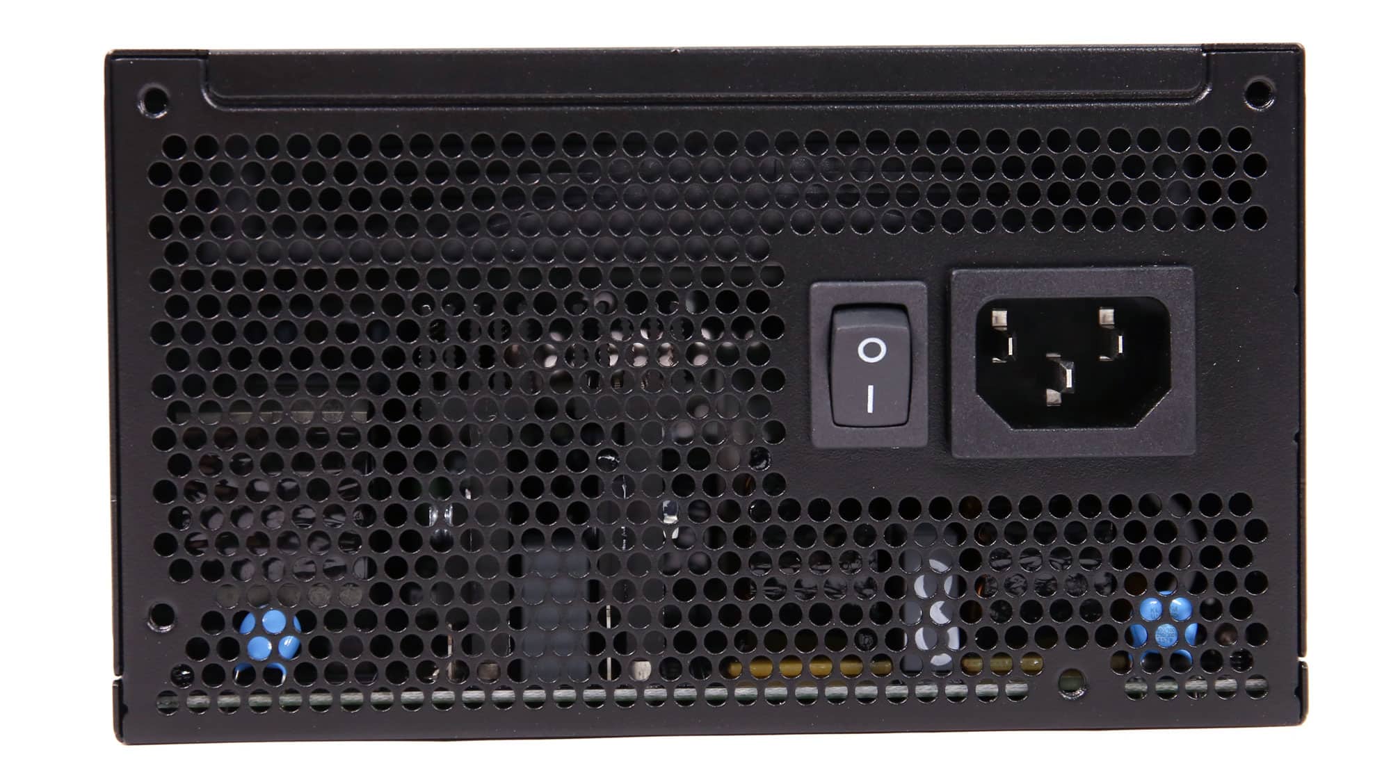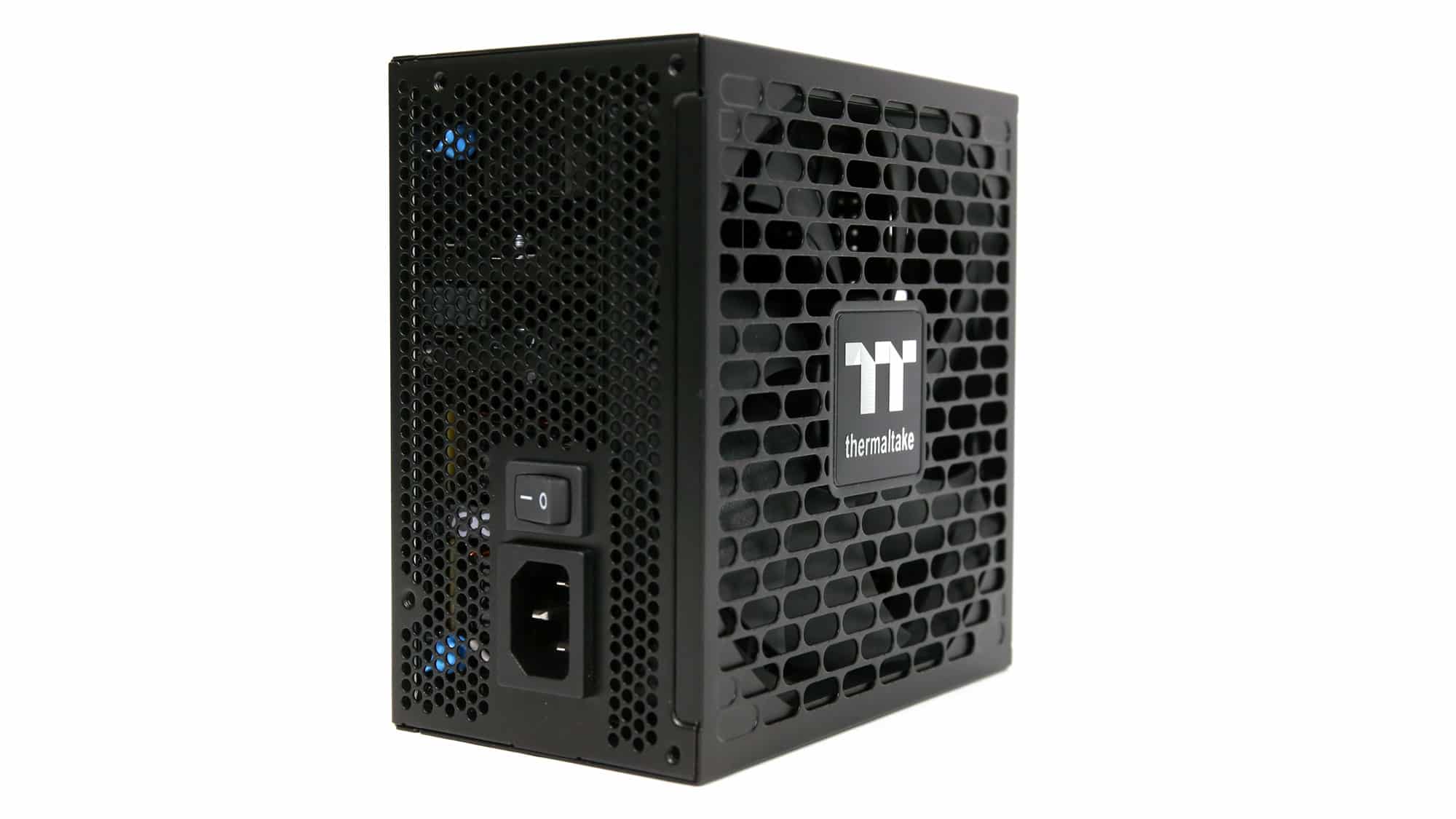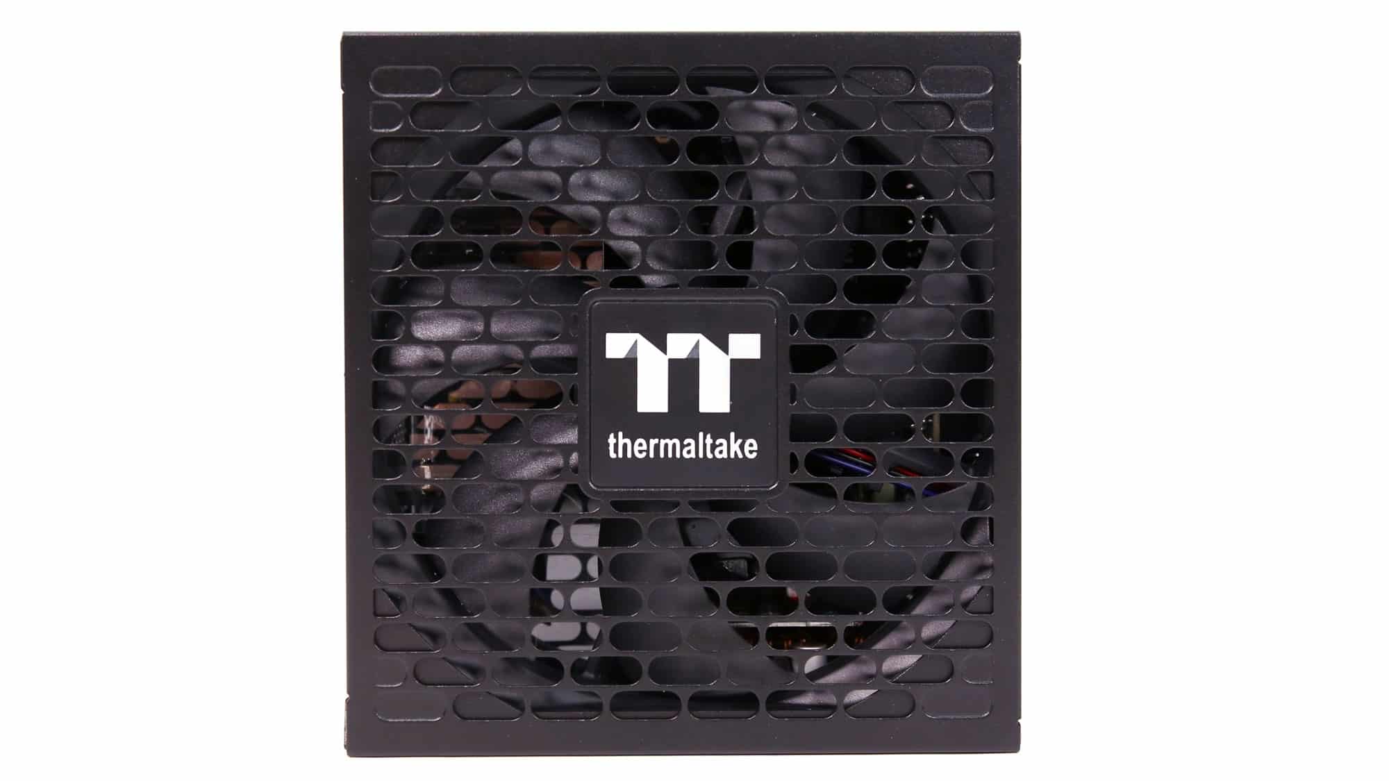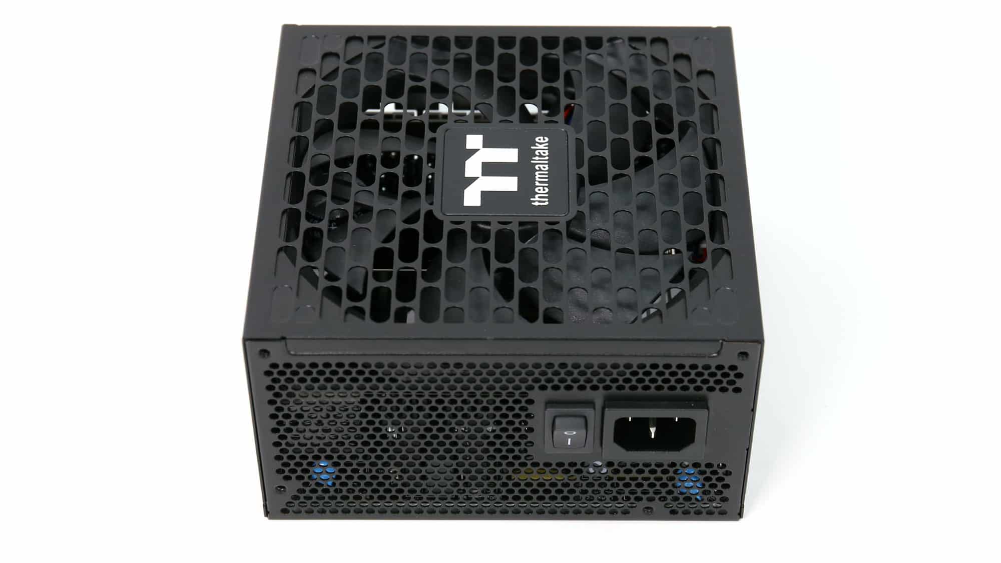 The PSU has a compact form factor, and its perforated fan grille with large openings ensures strong airflow—an essential detail given the small PCB layout and high power output. At the front, the unit includes the AC input socket and a power switch.