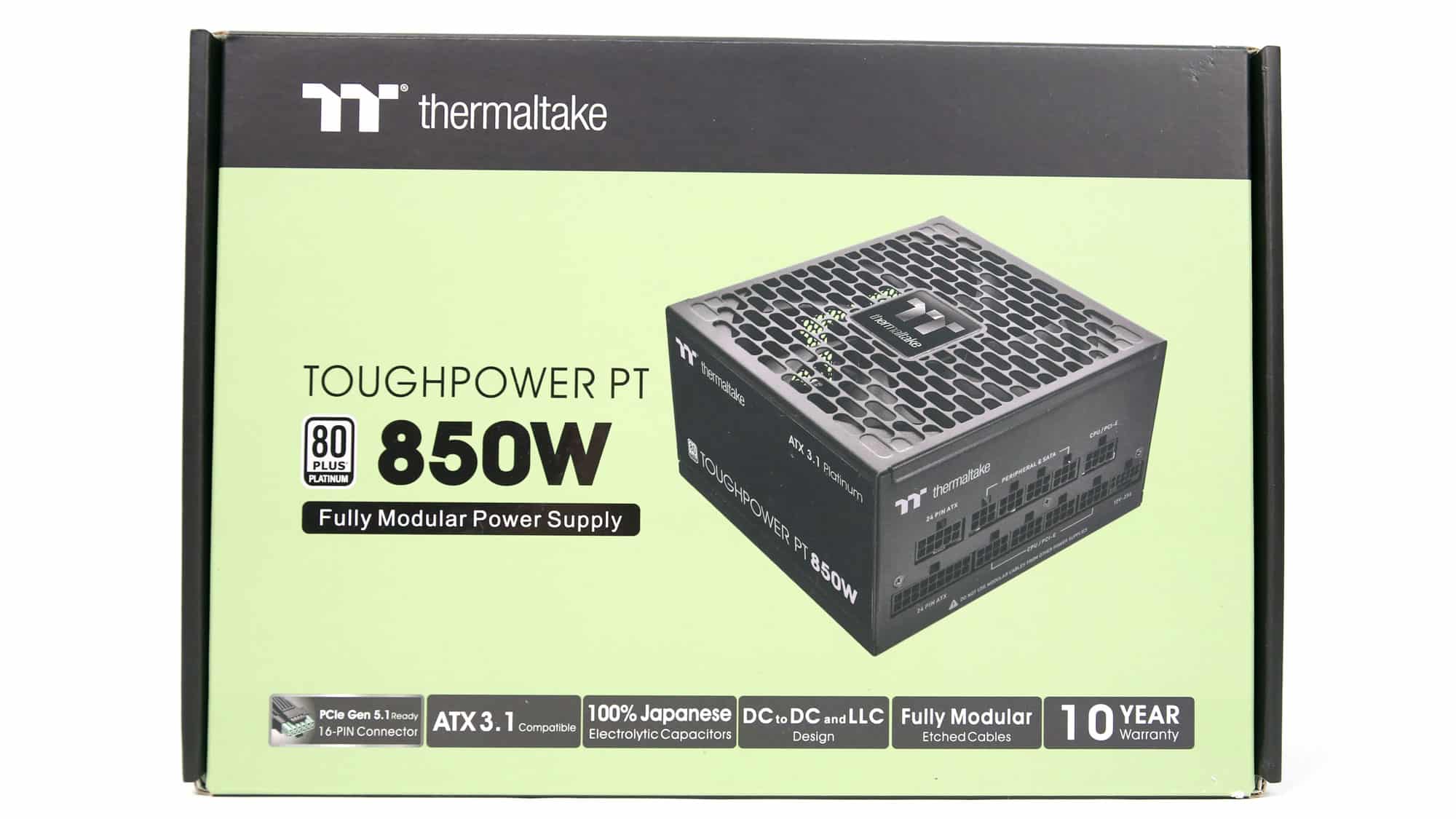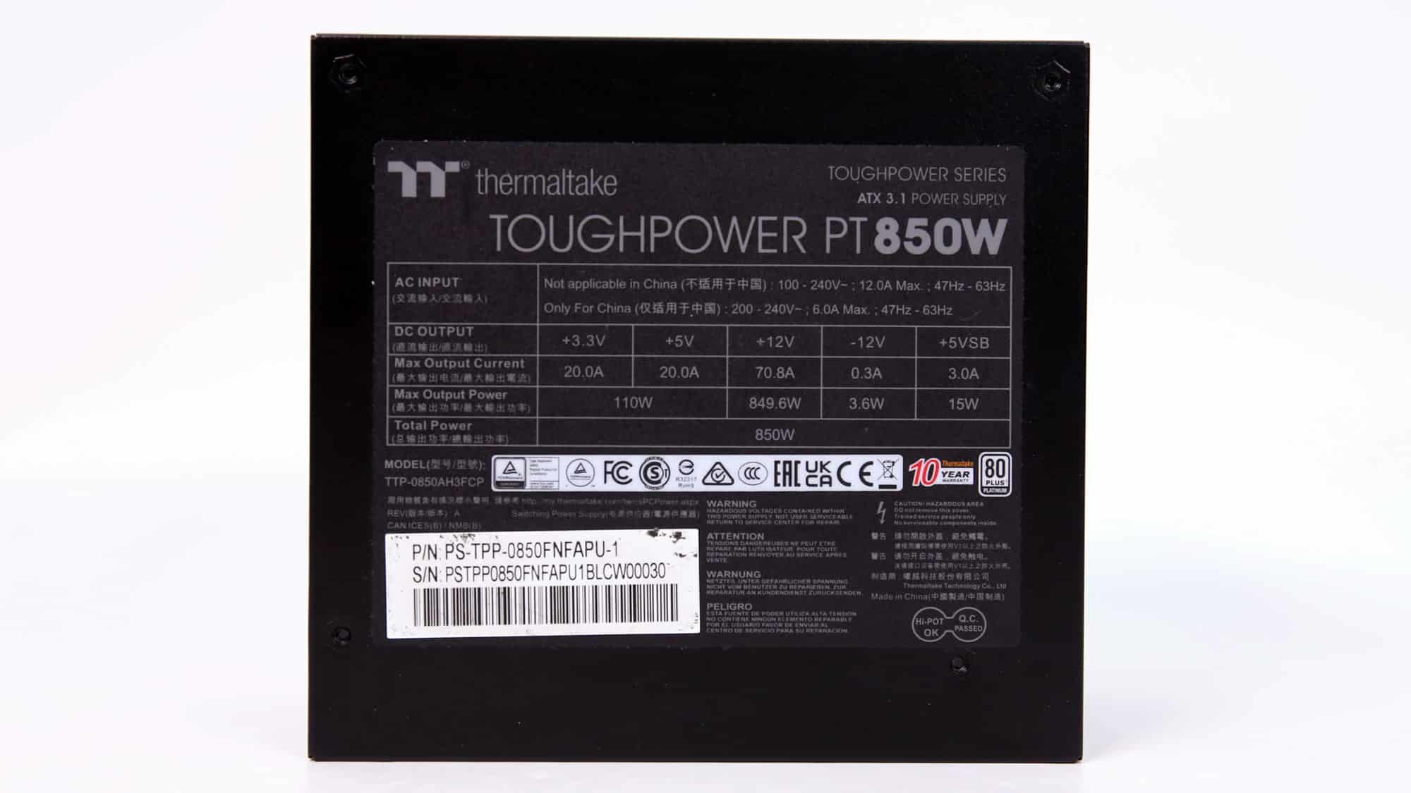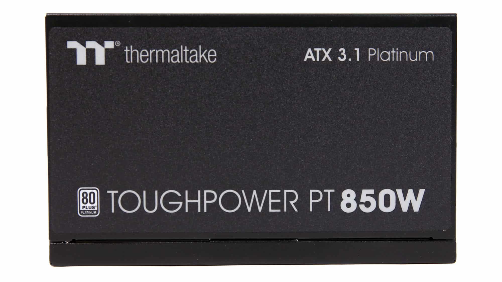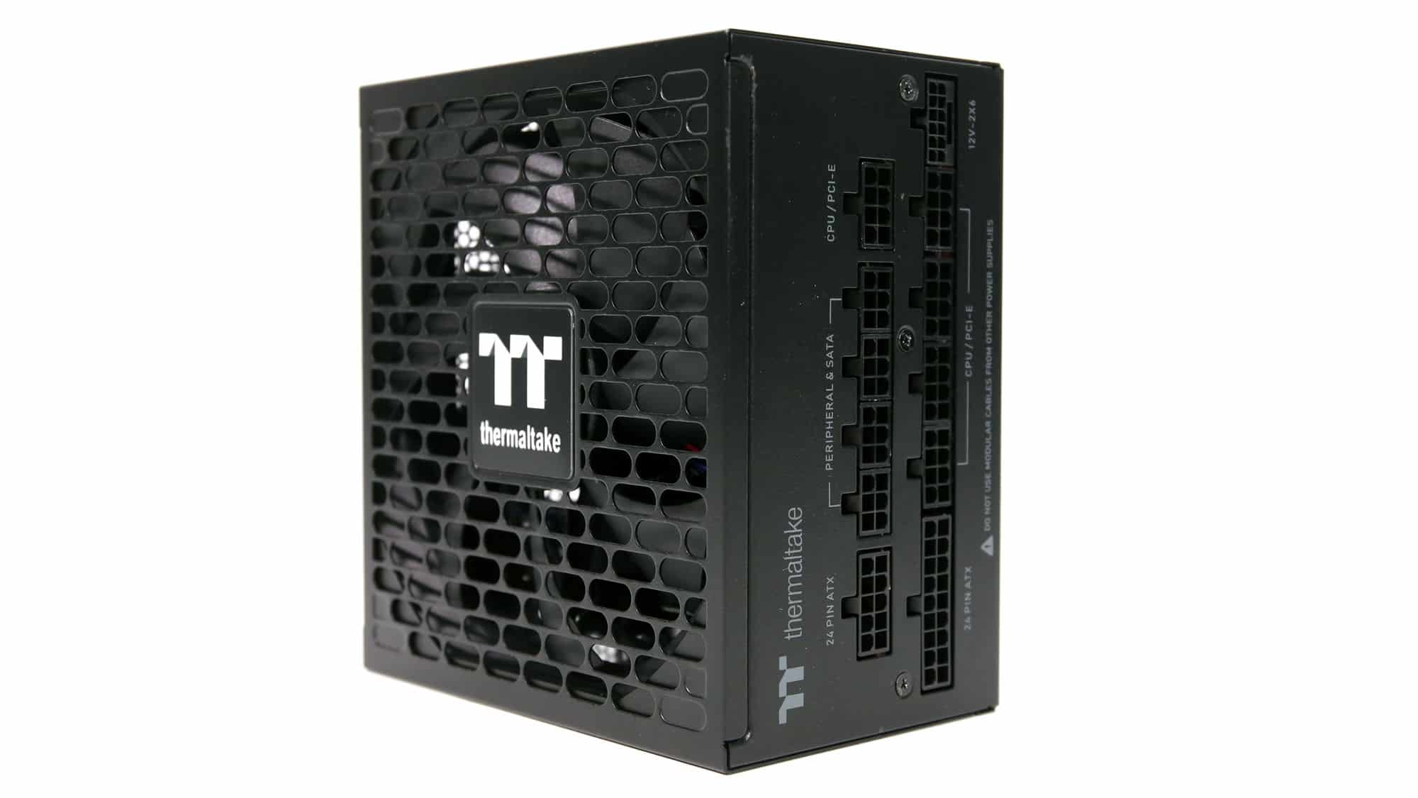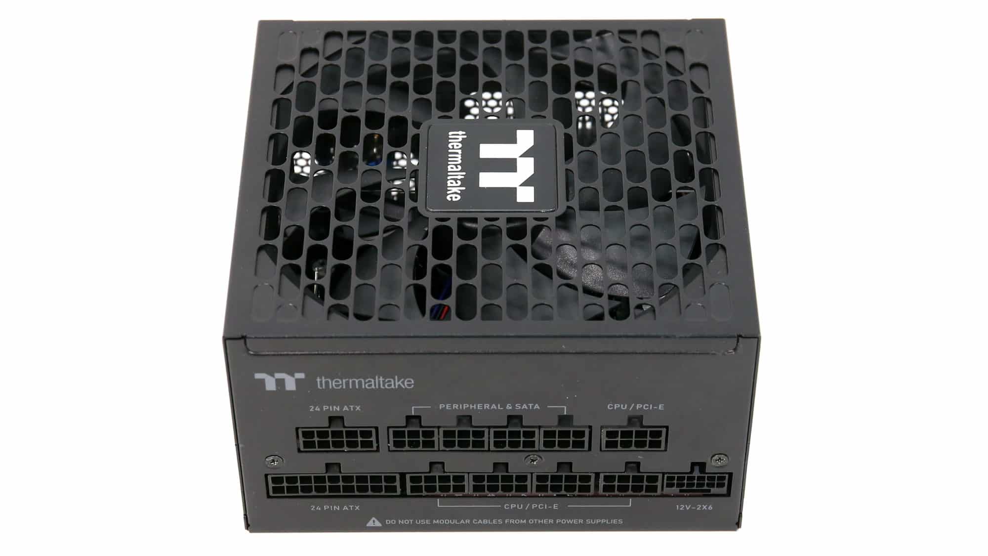 The PSU has a compact form factor, and its perforated fan grille with large openings ensures strong airflow—an essential detail given the small PCB layout and high power output. At the front, the unit includes the AC input socket and a power switch.
