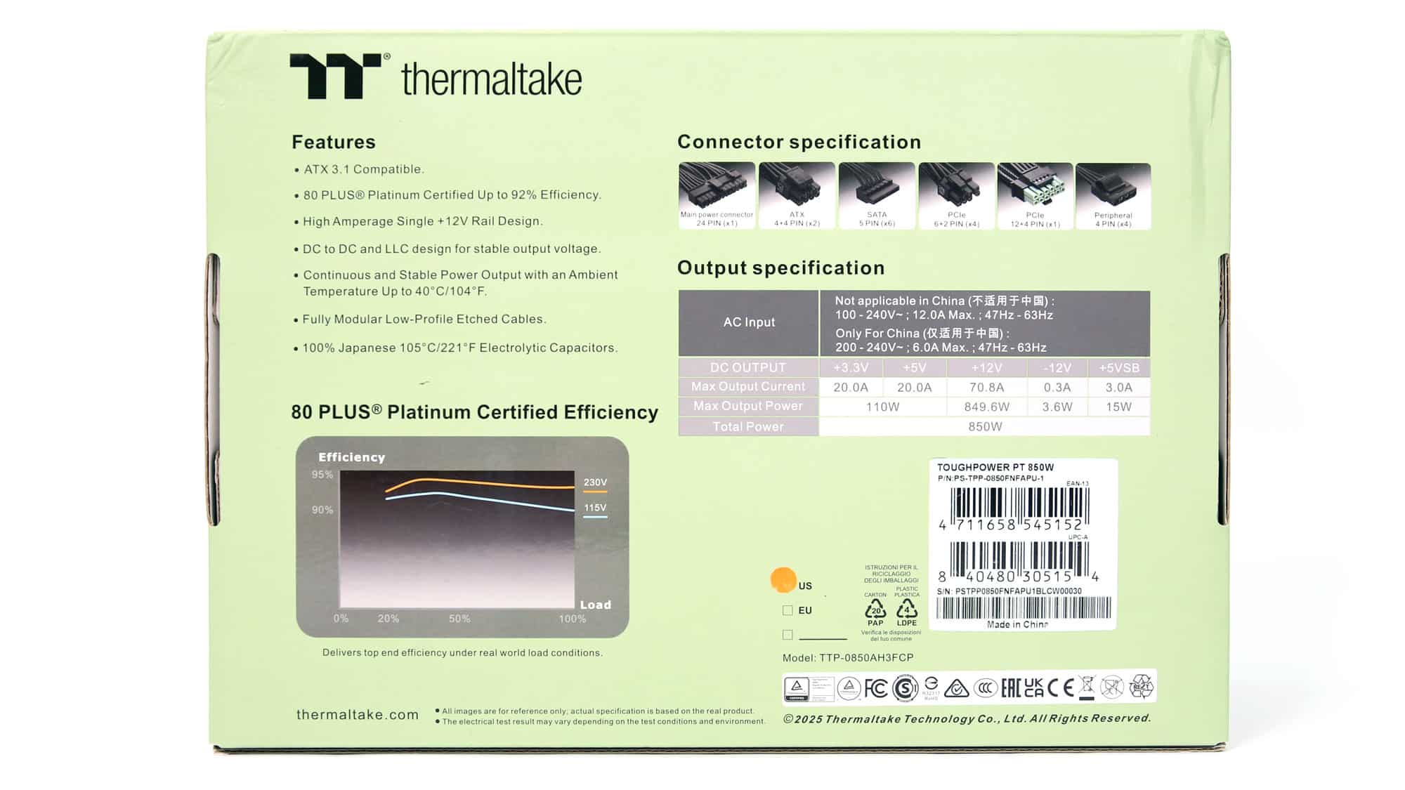 The box features a photo of the PSU on the front, accompanied by several badges highlighting key features, including ATX v3.1 compliance, a 12V-2×6 connector, and fully modular cabling. Inside, everything is neatly organized, and the included protection is sufficient. A pouch is provided for storing the modular cables—useful for keeping unused ones tidy. Finally, all documentation comes packed separately in a nylon bag.