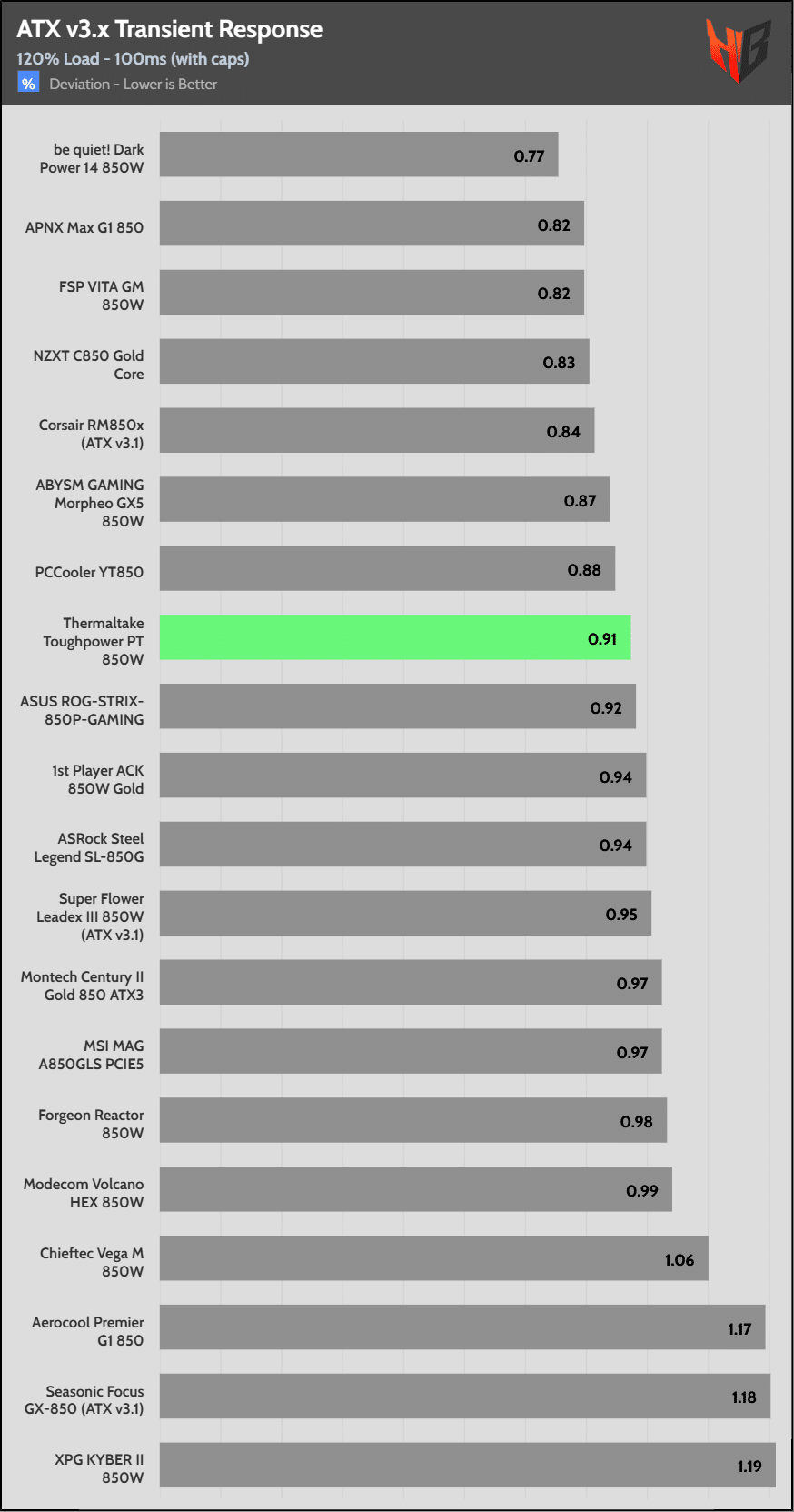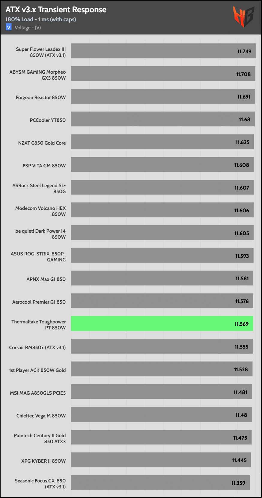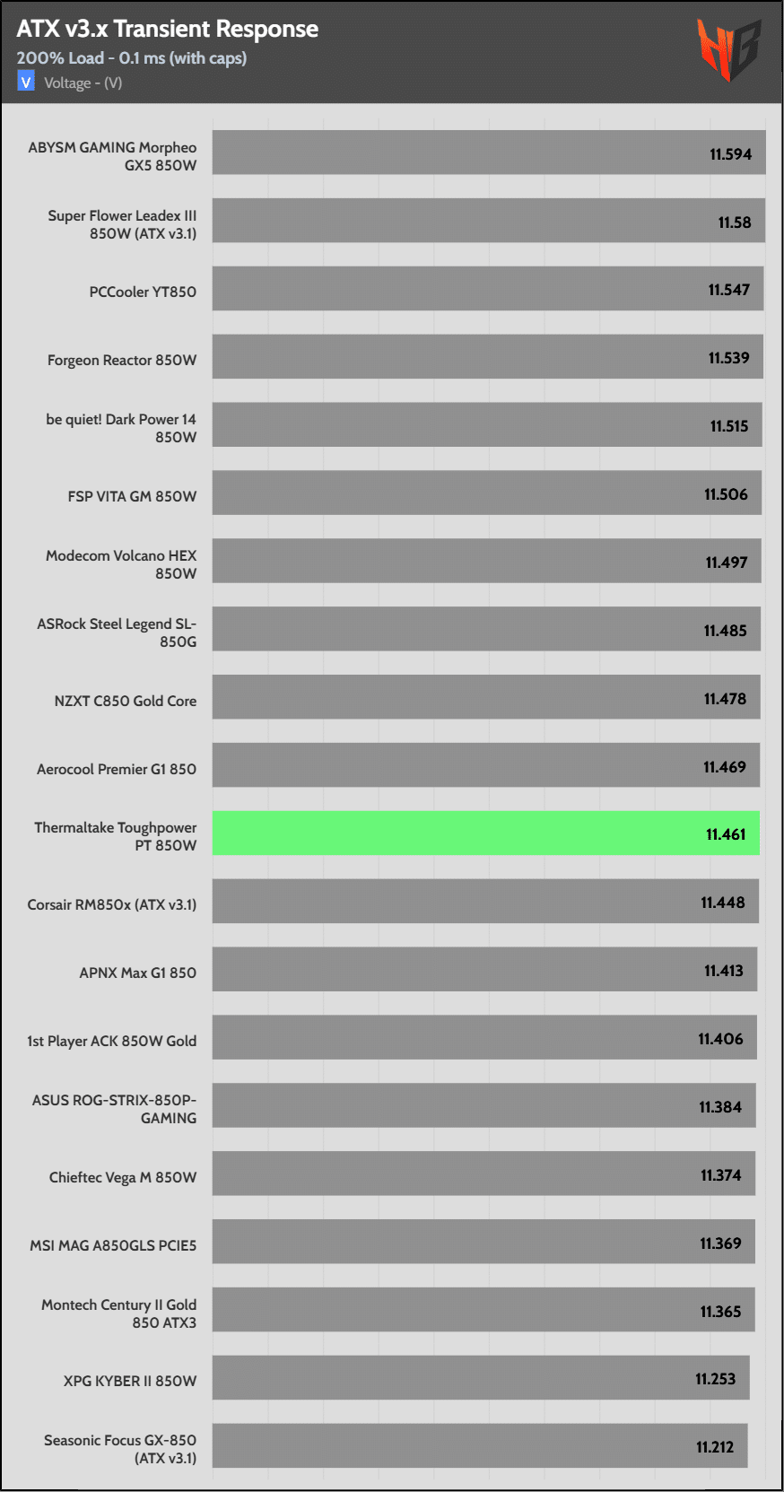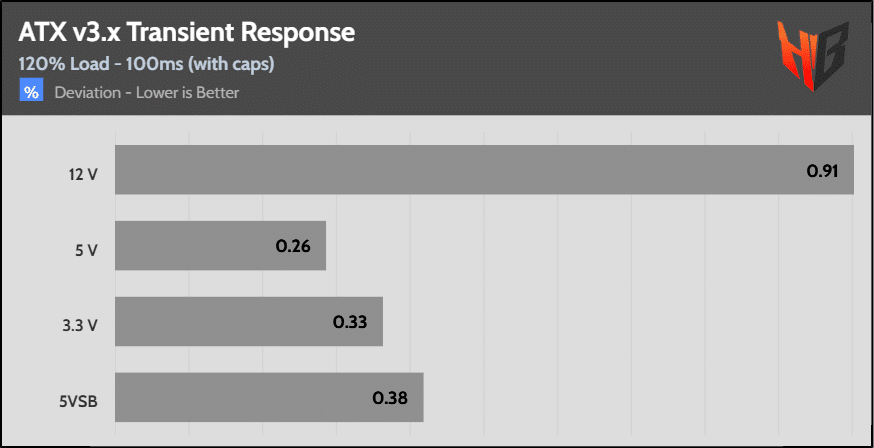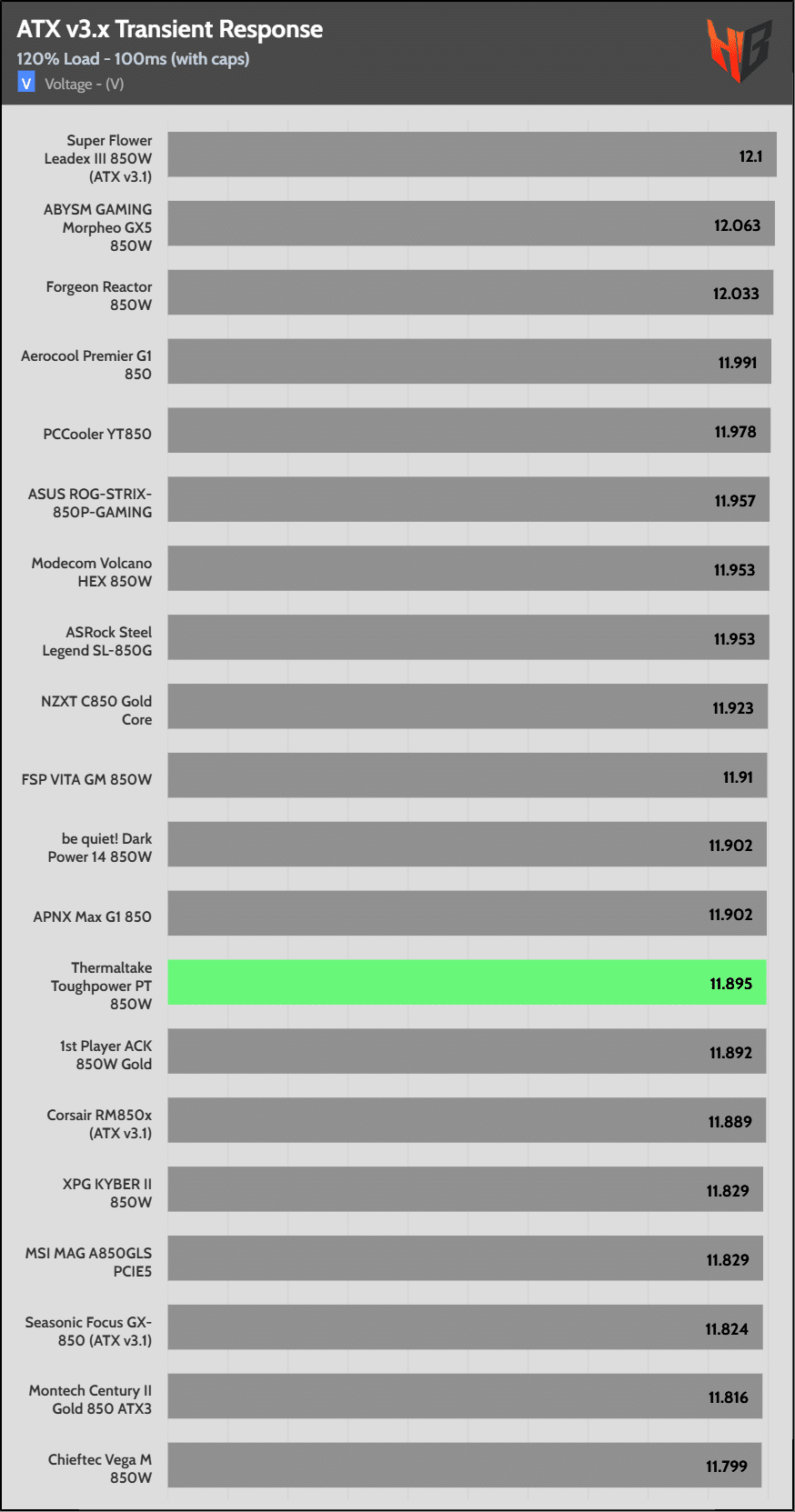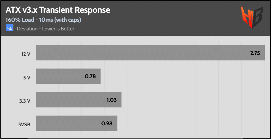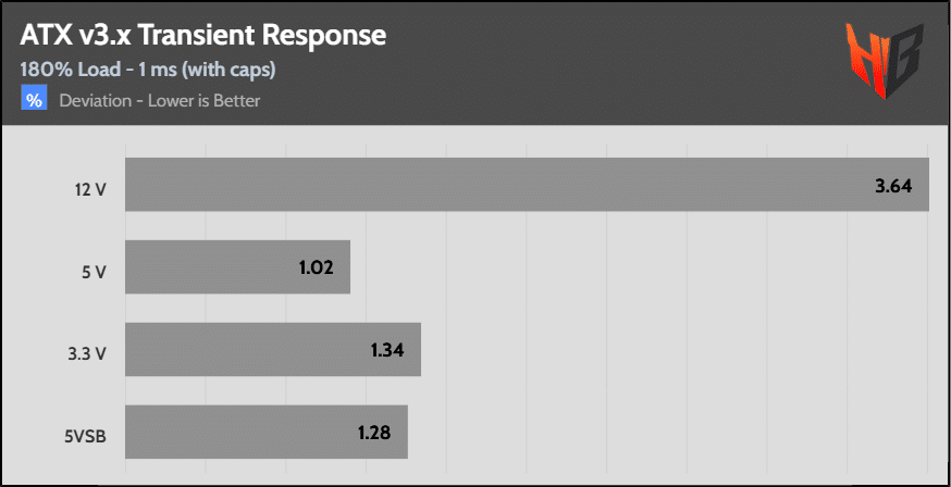 [Note] For PSUs without a 12+4 pin connector, the maximum applied load for the transient response tests is 150%, rather than 200%.The PSU passes all ATX v3.1 transient response tests.