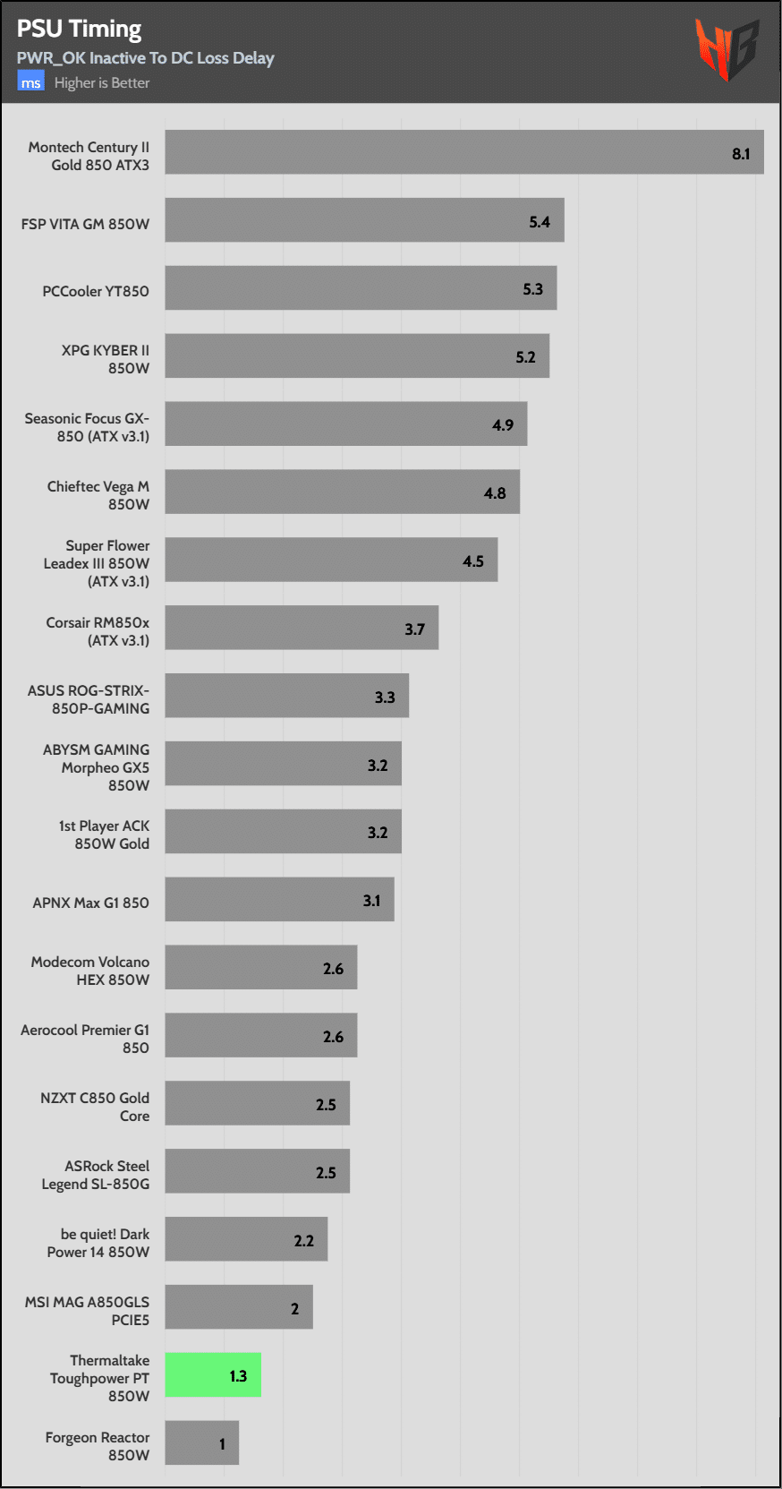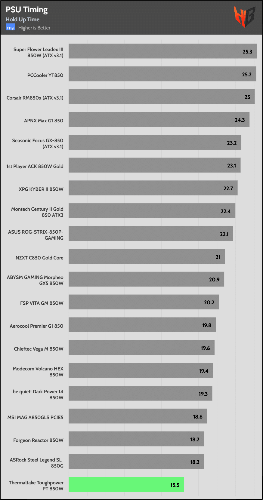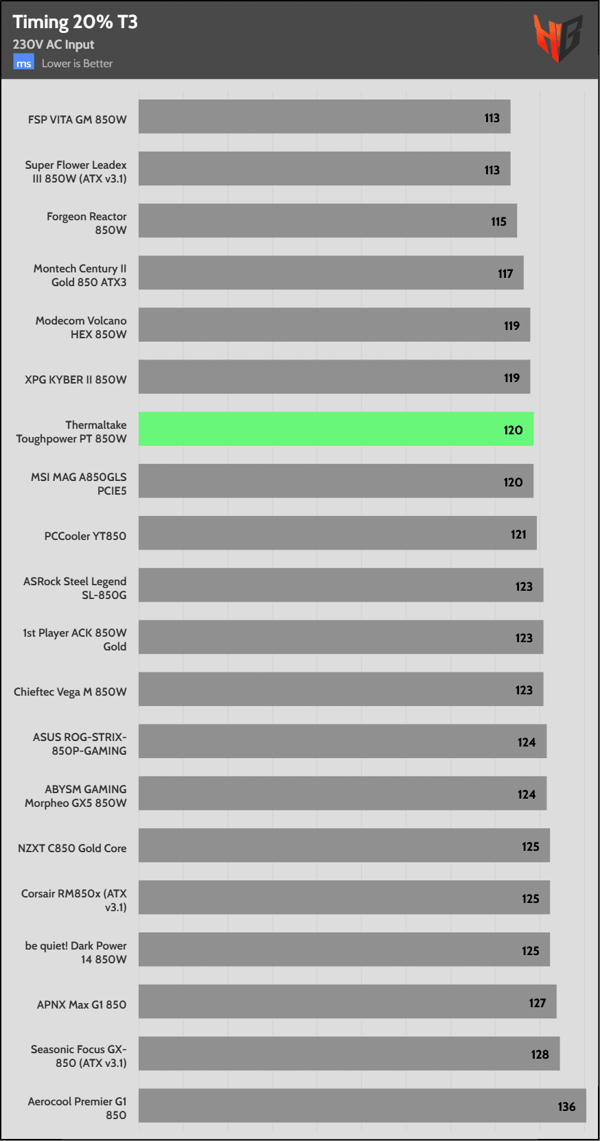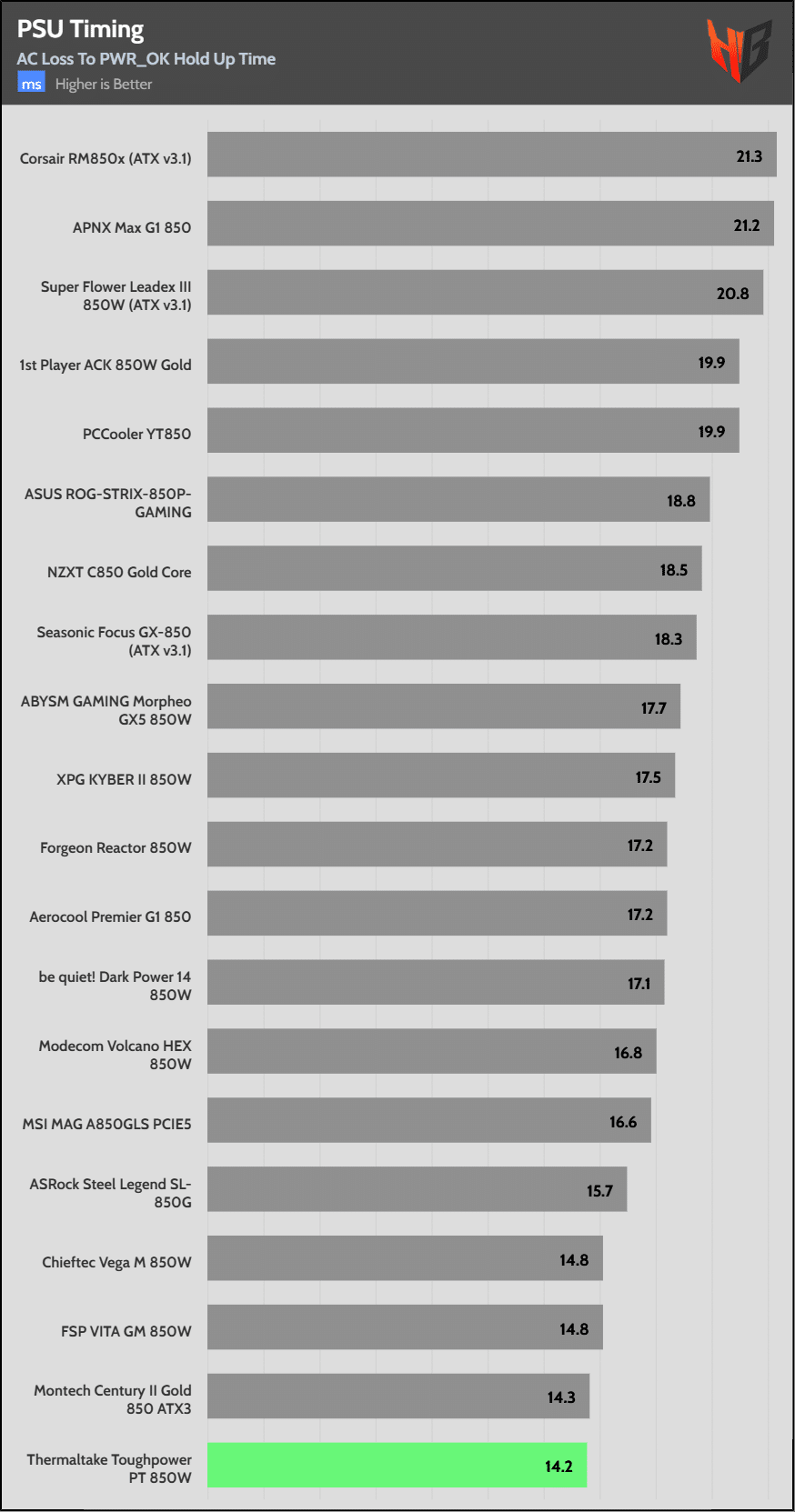 The hold-up time is lower than 17ms, still above the 12ms period that the ATX v3.1 spec. I disagree with the looser hold-up time spec of the ATX v3.1 spec.
