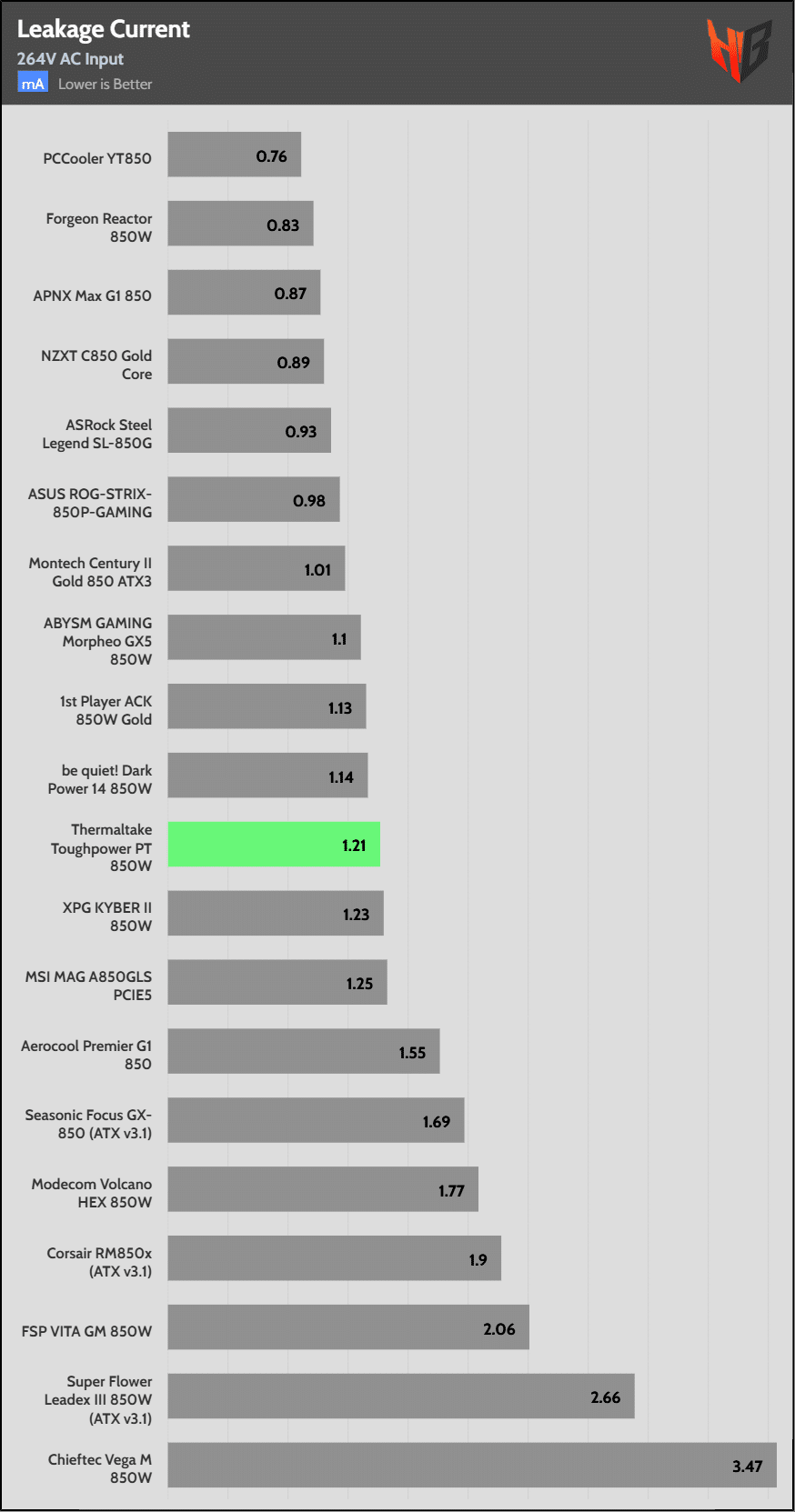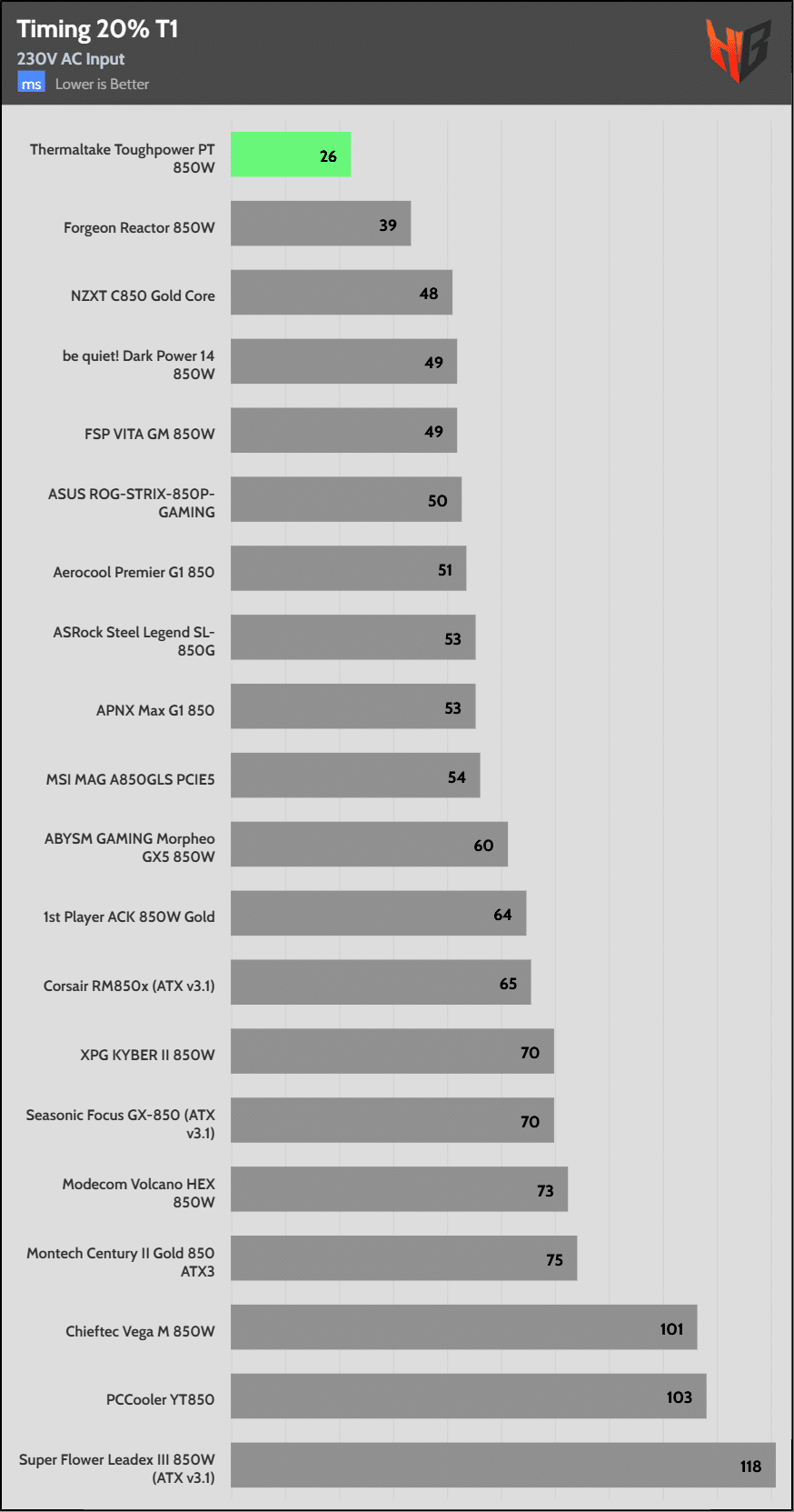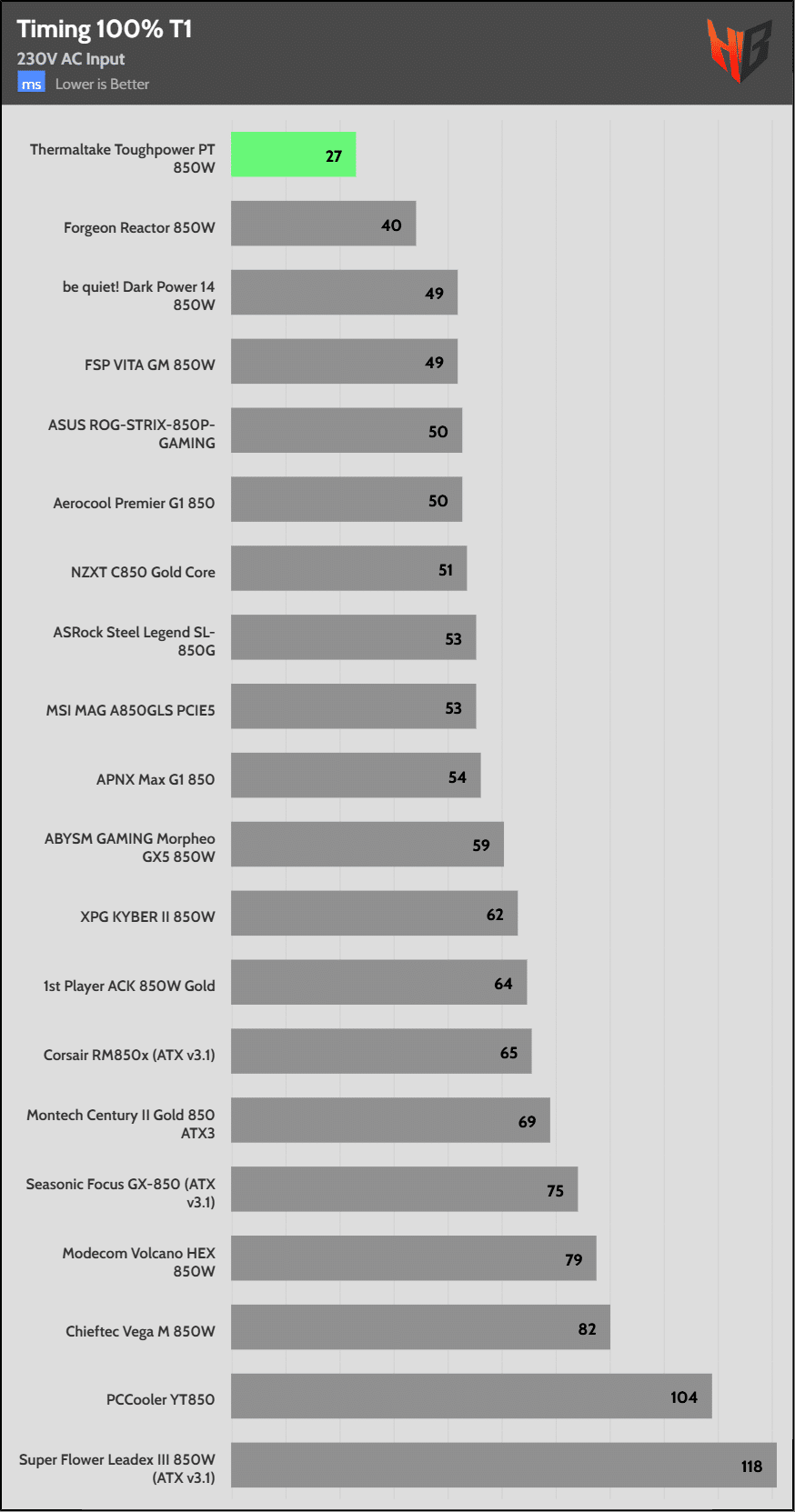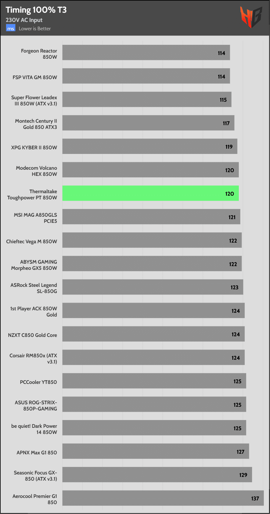 The hold-up time is lower than 17ms, still above the 12ms period that the ATX v3.1 spec. I disagree with the looser hold-up time spec of the ATX v3.1 spec.