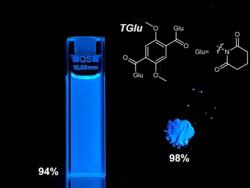A record-breaking fluorescent molecule developed by University of Michigan researchers shines brighter than ever, offering up to 98% efficiency in solids and 94% in liquids.